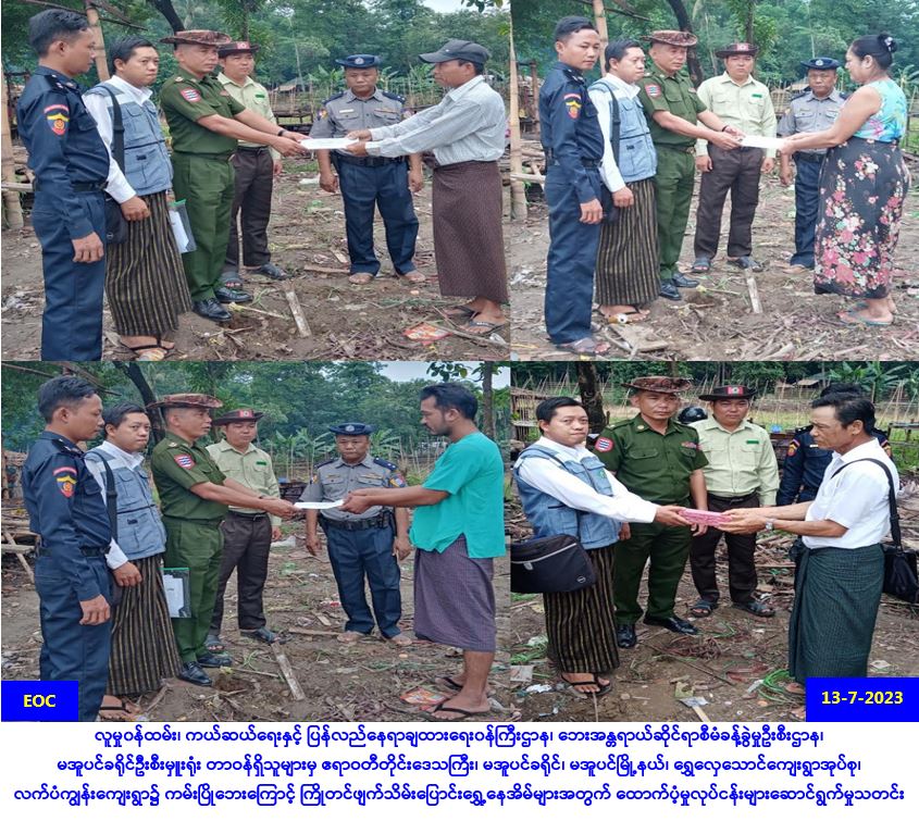 လူမှု၀န်ထမ်း၊ ကယ်ဆယ်ရေးနှင့် ပြန်လည်နေရာချထားရေး၀န်ကြီးဌာန၊ ဘေးအန္တရာယ်ဆိုင်ရာစီမံခန့်ခွဲမှု ဦးစီးဌာန၊ မအူပင်ခရိုင်ဦးစီးမှူးရုံးမှ တာဝန်ရှိသူများသည် ဧရာဝတီတိုင်းဒေသကြီး၊ မအူပင်ခရိုင်၊ မအူပင်မြို့နယ်၊ ရွှေလှေသောင်ကျေးရွာအုပ်စု၊ လက်ပံကျွန်းကျေးရွာ၌ (၁၃-၇-၂၀၂၃) ရက်နေ့တွင် ဖြစ်ပွား ခဲ့သော ကမ်းပြိုဘေးကြောင့် ကြိုတင်ဖျက်သိမ်းပြောင်းရွှေ့ခဲ့ရသည့် နေအိမ် (၃)လုံး၊ အိမ်ထောင်စု (၃)စုမှ လူဦးရေ (၁၄)ဦးအတွက် ဆန်ရိက္ခာဖိုးငွေ (၇)ရက်စာ (၂၉,၄၀ဝ/-)၊ အိမ်ဆောက်ပစ္စည်းဖိုး ထောက်ပံ့ငွေ (၃၀၀,၀၀ဝ/-)၊ စုစုပေါင်း ထောက်ပံ့ငွေ (၃၂၉,၄၀ဝ/-)ကျပ်နှင့် ကာဘော်လိပ်ဆပ်ပြာ (၃) တောင့်တို့ အား (၁၄-၇-၂၀၂၃) ရက်နေ့၊ (၁၁း၀၀)နာရီအချိန်တွင် မြို့နယ်စီမံအုပ်ချုပ်ရေးအဖွဲ့အတွင်းရေးမှူး၊ အဖွဲ့၀င် များနှင့်အတူ သက်ဆိုင်ရာကျေးရွာအုပ်ချုပ်ရေးမှူးတို့နှင့်အတူ ဘေးသင့်ပြည်သူများထံ မြေပြင်ကွင်းဆင်း ထောက်ပံ့ပေးအပ်ခဲ့ကြောင်း သတင်းရရှိပါသည်။