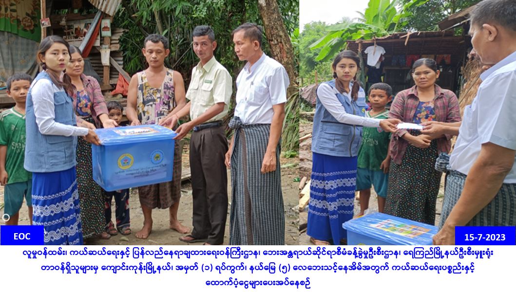 လူမှုဝန်ထမ်း၊ ကယ်ဆယ်ရေးနှင့် ပြန်လည်နေရာချထားရေး ဝန်ကြီးဌာန၊ ဘေးအန္တရာယ်ဆိုင်ရာ စီမံခန့်ခွဲမှုဦးစီးဌာန၊ ရေကြည်မြို့နယ်ဦးစီးမှူးရုံးမှတာဝန်ရှိသူများသည် ကျောင်းကုန်းမြို့နယ်၊ အမှတ်(၁)ရပ်ကွက်၊ နယ်မြေ (၅)၌ (၁၃-၇-၂၀၂၃) ရက်နေ့တွင် ဖြစ်ပွားခဲ့သော လေဘေးကြောင့် ပြိုကျအိမ်ခြေ (၁)လုံးအတွက် အိမ်ဆောက်ပစ္စည်းဖိုးငွေ (၂၀၀,၀၀ဝ/-)၊ အိမ်ထောင်စု(၁)စုမှ လူဦးရေ (၇)ဦးအတွက် ဆန်ရိက္ခာဖိုးငွေ (၇)ရက်စာ (၁၄,၇၀ဝ/-)၊ စုစုပေါင်း ထောက်ပံ့ငွေ (၂၁၄,၇၀၀/)ကျပ်နှင့် ကယ်ဆယ်ရေးပစ္စည်း(၁၇)မျိုးပါ(၁)ပုံးတို့အား (၁၅-၇-၂၀၂၃) ရက်နေ့ (၁၅:၃၀) နာရီအချိန်တွင် တာဝန်ရှိသူများရှေ့မှောက်၌ ဘေးသင့်ပြည်သူများ လက်ဝယ် အရောက်ထောက်ပံ့ပေးအပ်ခဲ့ကြောင်း သတင်းရရှိပါသည်။
