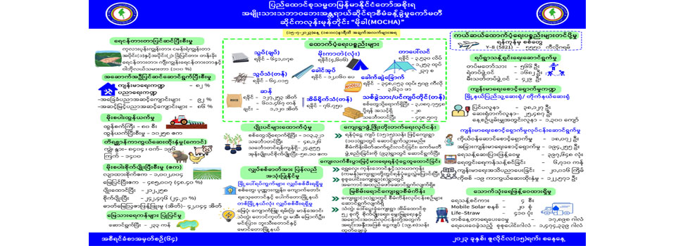 ဆိုင်ကလုန်းမုန်တိုင်း “မိုခါ(MOCHA)” ပြန်လည်ထူထောင်ရေးနှင့် ထောက်ပံ့ရေးလုပ်ငန်းများနှင့် စပ်လျဉ်း၍ (၁၅-၇-၂၀၂၃)နေ့၊ (၁၈:၀၀) နာရီအချိန်ထိ အချက်အလက်များအရ တိုင်းဒေသကြီး/ပြည်နယ်အလိုက် ဆောင် ရွက်ခဲ့မှုအခြေအနေမှာ အောက်ပါအတိုင်း ဖြစ်ပါသည်-