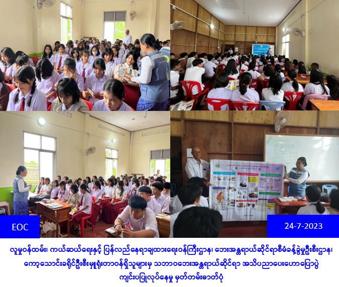 လူမှုဝန်ထမ်း၊ ကယ်ဆယ်ရေးနှင့် ပြန်လည်နေရာချထားရေးဝန်ကြီးဌာန၊ ဘေးအန္တရာယ်ဆိုင်ရာ စီမံခန့်ခွဲမှုဦးစီးဌာန၊ ကော့သောင်းခရိုင်ဦးစီးမှူးရုံးမှတာဝန်ရှိသူများသည် (၂၄-၇-၂၀၂၃)ရက်နေ့ ၊ (၁၃:၀၀) နာရီအချိန်တွင် ကော့သောင်းမြို့နယ်၊ အောင်သုခရပ်ကွက်၊ မေတ္တာစိုးကိုယ်ပိုင်အထက်တန်းကျောင်း၌ ကျောင်းသား၊ ကျောင်းသူ (၁၃၀)ဦးအား သဘာဝဘေးအန္တရာယ် နှင့်ပတ်သက်၍ ဆောင်ရန်ရှောင်ရန်များ၊ ဦးစီးဌာန၏ လုပ်ငန်းတာဝန်များအား ရှင်းလင်းပြောကြားခြင်း၊ လက်ကမ်းစာစောင်များဖြန့်ဝေခြင်းဖြင့် သဘာဝဘေးအသိပညာပေးဟောပြောပွဲကျင်းပပြုလုပ်ခဲ့ကြောင်းသတင်းရရှိပါသည်။