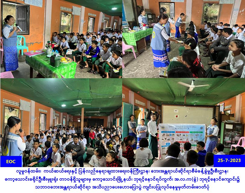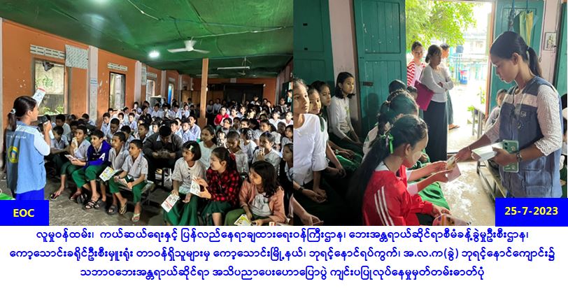 လူမှုဝန်ထမ်း၊ ကယ်ဆယ်ရေးနှင့် ပြန်လည်နေရာချထားရေးဝန်ကြီးဌာန၊ ဘေးအန္တရာယ်ဆိုင်ရာစီမံခန့်ခွဲမှုဦးစီး ဌာန၊ ကော့သောင်းခရိုင်ဦးစီးမှူးရုံးမှ တာဝန်ရှိသူများသည် (၂၅-၇-၂၀၂၃) ရက်နေ့ ၊ နံနက် (၁၀:၀၀) နာရီအချိန်တွင် ကော့သောင်းမြို့နယ်၊ ဘုရင့်နောင်ရပ်ကွက်၊ အ.လ.က(ခွဲ) ဘုရင့်နောင်ကျောင်း၌ ကျောင်းသား၊ ကျောင်းသူ (၁၀၀) ဦးတို့အား သဘာဝဘေးအန္တရာယ်နှင့်ပတ်သက်၍ ဆောင်ရန်/ရှောင်ရန်များ၊ ဦးစီးဌာန၏လုပ်ငန်းတာဝန်များအား ရှင်းလင်းပြောကြားခြင်း၊ လက်ကမ်းစာစောင်များ ဖြန့်ဝေခြင်းနှင့် သဘာဝဘေးအသိပညာပေးဟောပြောခြင်းများ ဆောင်ရွက်ခဲ့ပါကြောင်း သတင်းရရှိပါသည်။