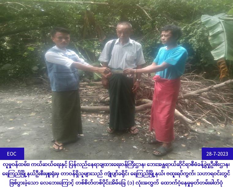 လူမှုဝန်ထမ်း၊ ကယ်ဆယ်ရေးနှင့် ပြန်လည်နေရာချထားရေးဝန်ကြီးဌာန၊ ဘေးအန္တရာယ်ဆိုင်ရာစီမံခန့်ခွဲမှုဦးစီး ဌာန၊ ရေကြည်မြို့နယ်ဦးစီးမှူးရုံးမှ တာဝန်ရှိသူများသည် (၂၇-၇-၂၀၂၃) ရက်နေ့၌ ကျုံပျာ်ခရိုင်၊ ရေကြည်မြို့နယ်၊ ဗထူးရပ်ကွက်၊ သဟာရဝင်းတွင် ဖြစ်ပွားခဲ့သော လေဘေးကြောင့် တစ်စိတ်တစ်ပိုင်းအိမ်ခြေ (၁)လုံးအတွက် အိမ်ဆာက်ပစ္စည်းဖိုး(၅၀၀၀၀/-) အိမ်ထောင်စု(၁)စုမှ လူဦးရေ(၇)ဦး အတွက်ဆန်ရိက္ခာ (၇)ရက်စာရန်ပုံငွေ (၁၄၇၀ဝ/-)၊ စုစုပေါင်းကယ်ဆယ်ရေးရန်ပုံငွေကျပ် (၆၄၇၀၀/)အား (၂၈-၇-၂၀၂၃)ရက်နေ (၁၄း၀၀) နာရီအချိန် တွင် တာဝန်ရှိသူများရှေ့မှောက်၌ ဘေးသင့်ပြည်သူများ လက်ဝယ်အရောက်ထောက်ပံ့ပေးအပ်ခဲ့ပါကြောင်း သတင်းရရှိပါသည်။