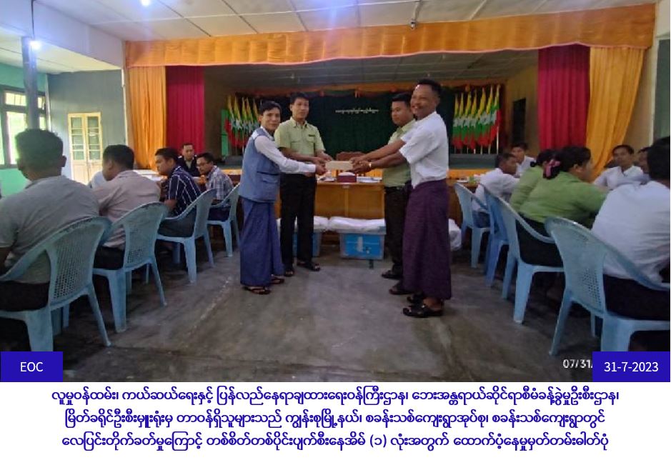 လူမှုဝန်ထမ်း၊ ကယ်ဆယ်ရေးနှင့် ပြန်လည်နေရာချထားရေးဝန်ကြီးဌာန၊ ဘေးအန္တရာယ်ဆိုင်ရာစီမံခန့်ခွဲမှုဦးစီး ဌာန၊ မြိတ်ခရိုင်ဦးစီးမှူးရုံးမှ တာဝန်ရှိသူများသည် (၂၇-၇-၂၀၂၃)ရက်နေ့၌ ကျွန်းစုမြို့နယ်၊ စခန်းသစ်ကျေးရွာ အုပ်စု၊ စခန်းသစ်ကျေးရွာတွင် လေပြင်းတိုက်ခတ်မှုကြောင့် တစ်စိတ်တစ်ပိုင်းပျက်စီးနေအိမ်(၁)လုံးအတွက် အိမ်ဆောက်ပစ္စည်းဖိုး(၄၀,၀၀ဝ/-)ကျပ်၊ ဘေးသင့်အိမ်ထောင်စု(၁)စုမှ လူဦးရေ(၅)ဦးအတွက် ဆန်ရိက္ခာဖိုး (၁၀,၅၀ဝ/-)ကျပ်တို့အား (၃၁-၇-၂၀၂၃)ရက်နေ့ (၁၁း၃၀)အချိန်တွင် တာဝန်ရှိသူများရှေ့မှောက်၌ ဘေးသင့် ပြည်သူများလက်ဝယ်အရောက် ထောက်ပံ့ပေးအပ်ခဲ့ပါကြောင်း သတင်းရရှိပါသည်။