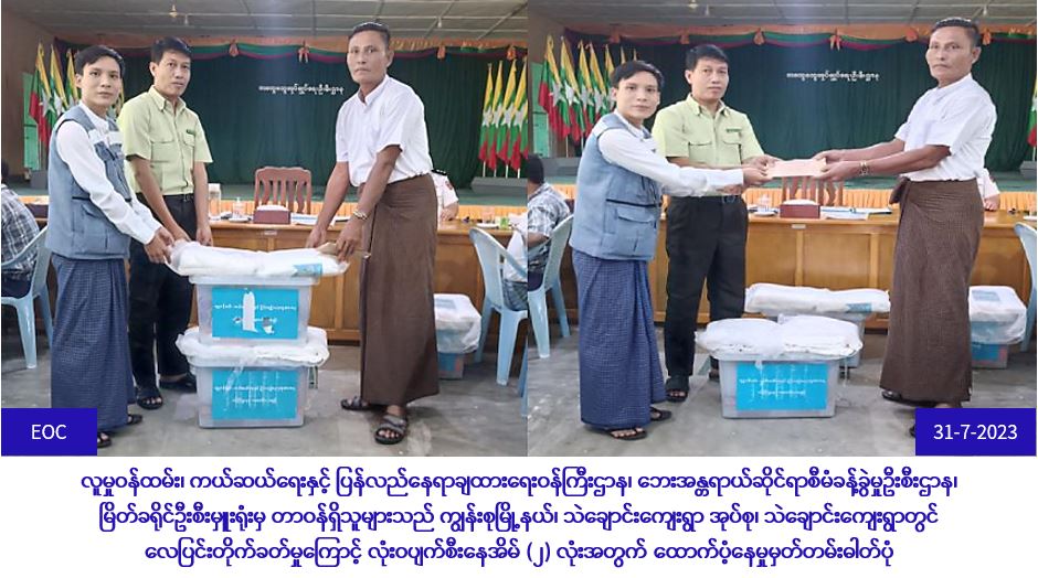 လူမှုဝန်ထမ်း၊ ကယ်ဆယ်ရေးနှင့် ပြန်လည်နေရာချထားရေးဝန်ကြီးဌာန၊ ဘေးအန္တရာယ်ဆိုင်ရာစီမံခန့်ခွဲမှုဦးစီး ဌာန၊ မြိတ်ခရိုင်ဦးစီးမှူးရုံးမှ တာဝန်ရှိသူများသည် (၁၉-၇-၂၀၂၃)ရက်နေ့ ကျွန်းစုမြို့နယ်၊ သဲချောင်းကျေးရွာ အုပ်စု၊ သဲချောင်းကျေးရွာတွင် လေပြင်းတိုက်ခတ်မှုကြောင့် လုံးဝပျက်စီးနေအိမ်(၂)လုံးအတွက် အိမ်ဆောက် ပစ္စည်းဖိုး(၂၀၀,၀၀ဝ/-)ကျပ်၊ ဘေးသင့်အိမ်ထောင်စု(၂)စုမှ လူဦးရေ(၁၀)ဦးအတွက် ဆန်ရိက္ခာဖိုး(၂၀,၀၀ဝ/-)ကျပ်နှင့် (၇၄,၉၈၆)ကျပ်တန်ဖိုးရှိ ကယ်ဆယ်ရေးပစ္စည်း(၁၈)မျိုးပါ (၁)ပုံးတို့အား (၃၁-၇-၂၀၂၃)ရက်နေ့ (၁၁း၃၀)အချိန်တွင် တာဝန်ရှိသူများရှေ့မှောက်၌ ဘေးသင့် ပြည်သူများလက်ဝယ်အရောက် ထောက်ပံ့ပေးအပ်ခဲ့ ပါကြောင်း သတင်းရရှိပါသည်။