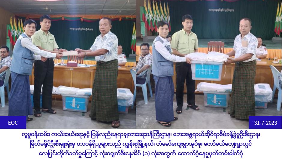 လူမှုဝန်ထမ်း၊ ကယ်ဆယ်ရေးနှင့် ပြန်လည်နေရာချထားရေးဝန်ကြီးဌာန၊ ဘေးအန္တရာယ်ဆိုင်ရာစီမံခန့်ခွဲမှုဦးစီး ဌာန၊ မြိတ်ခရိုင်ဦးစီးမှူးရုံးမှ တာဝန်ရှိသူများသည် (၁၈-၇-၂၀၂၃)ရက်နေ့ ကျွန်းစုမြို့နယ်၊ ကံမော်ကျေးရွာအုပ်စု၊ ကော်မယ်ကျေးရွာတွင် လေပြင်းတိုက်ခတ်မှုကြောင့် လုံးဝပျက်စီးနေအိမ်(၁)လုံးအတွက် အိမ်ဆောက် ပစ္စည်းဖိုး(၁၀၀,၀၀ဝ/-)ကျပ်၊ ဘေးသင့်အိမ်ထောင်စု(၁)စုမှ လူဦးရေ(၃)ဦးအတွက် ဆန်ရိက္ခာဖိုး(၆,၃၀ဝ/-)ကျပ်၊ စုစုပေါင်းကယ်ဆယ်ရေးရန်ပုံငွေကျပ် (၁၀၆,၃၀၀/)နှင့် (၆၁,၇၆၀)ကျပ်တန်ဖိုးရှိ ကယ်ဆယ်ရေးပစ္စည်း(၁၈)မျိုးပါ (၁)ပုံးတို့အား (၃၁-၇-၂၀၂၃)ရက်နေ့ (၁၁း၃၀)အချိန်တွင် တာဝန်ရှိသူများရှေ့မှောက်၌ ဘေးသင့်ပြည်သူများ လက်ဝယ်အရောက် ထောက်ပံ့ပေးအပ်ခဲ့ပါကြောင်း သတင်းရရှိပါသည်။