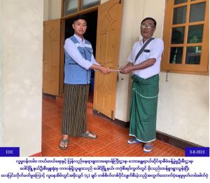 လူမှုဝန်ထမ်း၊ ကယ်ဆယ်ရေးနှင့် ပြန်လည်နေရာချထားရေးဝန်ကြီးဌာန၊ ဘေးအန္တရာယ်ဆိုင်ရာစီမံခန့်ခွဲမှုဦးစီး ဌာန၊ ပေါင်မြို့နယ်ဦးစီးမှူးရုံးမှ တာဝန်ရှိသူများသည် (၂-၈-၂၀၂၃)ရက်နေ့ (၀၈း၀၀)အချိန်တွင် ပေါင်မြို့နယ်၊ ကဒုံစီးရပ်ကွက်တွင် မိုးသည်းထန်စွာရွာသွန်းပြီး လေပြင်းတိုက်ခတ်မှုကြောင့် လူနေအိမ်တွင်အမိုးသွပ်(၄)ချပ် တစ်စိတ်တစ်ပိုင်းပျက်စီးခဲ့သည့်အတွက် အိမ်ဆောက်ပစ္စည်းဖိုးငွေ(၁၀,၀၀၀/-)နှင့် လူဦးရေ(၁)ဦးအတွက် (၇) ရက်စာဆန်ရိက္ခာဖိုးငွေ (၂,၁၀၀/-)၊ စုစုပေါင်းကျပ်(၁၂,၁၀၀/-)အား (၃-၈-၂၀၂၃)ရက်နေ့ (၁၂း၀၀)အချိန်တွင် ဘေးသင့်ပြည်သူများလက်ဝယ်ရောက် ထောက်ပံ့ပေးအပ်ခဲ့ပြီးဖြစ်ပါကြောင်း သတင်းရရှိပါသည်။
