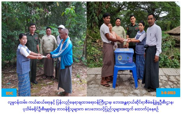 လူမှု၀န်ထမ်း၊ ကယ်ဆယ်ရေးနှင့် ပြန်လည်နေရာချထားရေး၀န်ကြီးဌာန၊ ဘေးအန္တရာယ်ဆိုင်ရာစီမံခန့်ခွဲမှုဦးစီးဌာန၊ ပုသိမ်ခရိုင်ဦးစီးမှုးရုံးမှ တာဝန်ရှိသူများသည် (၂.၈.၂၀၂၃)ရက်နေ့တွင် ပုသိမ်မြို့၊ အမှတ်(၁၀)ရပ်ကွက်၌ မိုးရွာသွန်းပြီး လေပြင်းတိုက်ခတ်မှုကြောင့် သစ်ပင်လဲကျ၍ ပြိုကျပျက်စီးခဲ့သော လူနေအိမ်(၁)လုံးအတွက် အိမ်ဆောက်ပစ္စည်းဖိုးထောက်ပံ့ငွေ(၁၀၀,၀၀ဝိ/-)၊ ဘေးသင့်လူဦးရေ(၄)ဦးအတွက် (၇)ရက်စာဆန်ရိက္ခာဖိုးထောက်ပံ့ငွေ(၈,၄၀ဝိ/-)၊ စုစုပေါင်းထောက်ပံ့ငွေကျပ် (၁၀၈,၄၀ဝိ/-)၊ (၄၆၀၃၆/-)တန်ဖိုးရှိ ကယ်ဆယ်ရေးပစ္စည်း(၁၆)မျိုး (စက္ကူပုံး)ပါ (၁)ပုံးနှင့် ပုသိမ်မြို့၊ မရမ်းချောင်းကျေးရွာအုပ်စု၊ မြန်မာမရမ်းချောင်းကျေးရွာ၌ ဖြစ်ပွားခဲ့သော လေဘေးကြောင့် သစ်ပင်ပိ၍ တစ်စိတ်တစ်ပိုင်းပျက်စီးခဲ့သော လူနေအိမ်(၁)လုံးအတွက် အိမ်ဆောက်ပစ္စည်းဖိုးထောက်ပံ့ငွေ(၅၀,၀၀ဝိ/-)၊ဘေးသင့်လူဦးရေ (၄)ဦးအတွက် (၇)ရက်စာ ဆန်ရိက္ခာဖိုးထောက်ပံ့ငွေ(၈,၄၀ဝိ/-)၊ စုစုပေါင်းထောက်ပံ့ငွေ(၅၈,၄၀ဝိ/-)တိတိတို့အား (၃-၈-၂၀၂၃)ရက်နေ့၌ ပုသိမ်မြို့နယ်စီမံအုပ်ချုပ်ရေးအဖွဲ့မှတာ၀န်ရှိသူများနှင့်အတူ ဘေးသင့်ပြည်သူများလက်၀ယ်အရောက် ထောက်ပံ့ပေးအပ်ခဲ့ပါကြောင်း သတင်းရရှိပါသည်။
