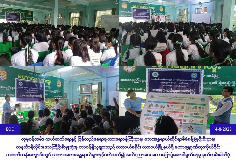 လူမှုဝန်ထမ်း၊ ကယ်ဆယ်ရေးနှင့် ပြန်လည်နေရာချထားရေးဝန်ကြီးဌာန၊ ဘေးအန္တရာယ်ဆိုင်ရာစီမံခန့်ခွဲမှုဦးစီးဌာန၊ တနင်္သာရီတိုင်းဒေသကြီဦးစီးမှူးရုံးမှ တာဝန်ရှိသူများသည် (၄-၈-၂၀၂၃) ရက်နေ့ နံနက်(၁၃:၀၀)အချိန်တွင် ထားဝယ်ခရိုင်၊ ထားဝယ်မြို့နယ်ရှိ မဟာရွှေဂုဏ်ထူးကိုယ်ပိုင်း အထက်တန်း ကျောင်းတွင် ကျောင်းသား/သူ (၂၅၀)ဦးခန့်အား သဘာဝဘေးအန္တရာယ်များနှင့်ပတ်သက်၍ အသိပညာပေး ဟောပြောပွဲဆောင်ရွက်ခြင်း၊ သဘာဝဘေးအသိပညာပေးလက်ကမ်းစာစောင်များနှင့် ဗွီနိုင်းပိုစတာ ဖြန့်ဝေခြင်းများ ဆောင်ရွက်ခဲ့ပါကြောင်း သတင်းရရှိပါသည်။