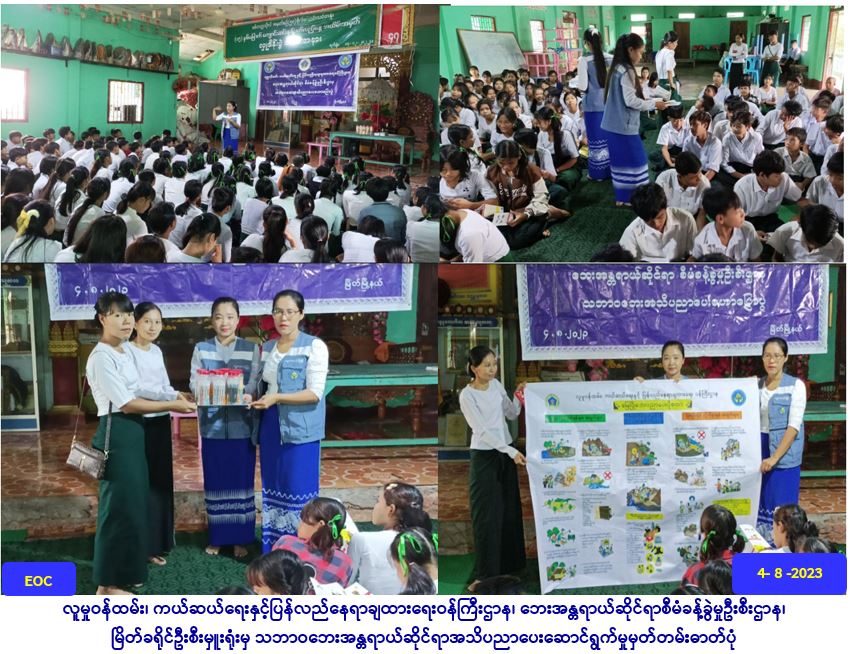 လူမှုဝန်ထမ်း၊ ကယ်ဆယ်ရေးနှင့်ပြန်လည်နေရာချထားရေးဝန်ကြီးဌာန၊ ဘေးအန္တရာယ်ဆိုင်ရာစီမံခန့်ခွဲမှု ဦးစီးဌာန၊ မြိတ်ခရိုင် ဦးစီးမှူးရုံးမှ တာဝန်ရှိသူများသည် (၄.၈.၂၀၂၃) ရက်နေ့ (၁၃:၀၀)နာရီချိန်တွင် မြိတ်မြို့၊ ငွေပုလဲရပ်၊ သံသရာအေး ဘ.က အလယ်တန်းကျောင်းတွင် ကျောင်းသား/သူ (၂၁၀)ဦး ခန့်အား သဘာဝဘေးအန္တရာယ်များနှင့်ပတ်သက်၍ အသိပညာပေးဟော ပြောပွဲဆောင်ရွက်ခြင်း၊ ဘောပင်များ ဝေငှခြင်း၊ သဘာဝဘေးအသိပညာပေးလက်ကမ်းစာစောင်များနှင့် မြေပြိုဘေး ဗွီနိုင်းပိုစတာ ဖြန့်ဝေခြင်း များ ဆောင်ရွက်ခဲ့ပါကြောင်း သတင်းရရှိပါသည်။