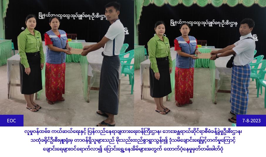လူမှုဝန်ထမ်း၊ ကယ်ဆယ်ရေးနှင့် ပြန်လည်နေရာချထားရေးဝန်ကြီးဌာန၊ ဘေးအန္တရာယ်ဆိုင်ရာစီမံခန့်ခွဲမှုဦးစီးဌာန သထုံခရိုင်ဦးစီးမှူးရုံးမှ တာဝန်ရှိသူများသည် (၅-၈-၂၀၂၃) ရက်နေ့တွင် မိုးသည်းထည်စွာရွာသွန်း၍ ဒုံသမိချောင်းရေ မြှင့်တက်မှုကြောင့် မြေနိမ့်ပိုင်းလူနေအိမ်များသို့ ချောင်းရေများဝင်ရောက်လာ၍ မွန်ပြည်နယ် သထုံခရိုင်၊ သထုံ မြို့နယ်၊ ဒူးရင်းဆိပ်ကျေးရွာရှိ ပြောင်းရွှေ့အိမ်ထောင်စု (၁၂)စုတို့မှ ကျား (၂၁)ဦး၊မ (၂၅)ဦး၊ စုစုပေါင်း (၄၆)ဦးတို့သည် တပ်ဦးဘုန်းကြီးကျောင်းကယ်ဆယ်ရေးစခန်း၌လည်းကောင်း၊ သထုံမြို့နယ်၊ ဈေးမသွယ်အထက်ကျေးရွာရှိ ပြောင်း ရွှေ့အိမ်ထောင်စု (၄)စုတို့မှ ကျား (၉)ဦး၊ မ (၇)ဦး၊ စုစုပေါင်းလူဦးရေ (၁၆)ဦးတို့သည် ရန်ကင်းအောင် ဘုန်းကြီးကျောင်း၌လည်းကောင်း၊ စုစုပေါင်းအိမ်ထောင်စု (၁၆)စု၊ ကျား (၃၀)ဦး၊မ (၃၂)ဦး၊ စုစုပေါင်းလူဦးရေ (၆၂)ဦးတို့အတွက် (၇)ရက်စာဆန်ရိက္ခာဖိုးငွေ (၁၃၀,၂၀၀/)အား (၇-၈-၂၀၂၃)ရက်နေ့၊ (၁၃း၃၀)နာရီအချိန်ခန့်တွင် သထုံမြို့နယ်စီမံအုပ်ချုပ်ရေးအဖွဲ့တို့နှင့်အတူ ဘေးသင့်ပြည်သူများထံ သွားရောက်ထောက်ပံ့ပေးအပ်ခဲ့ပါကြောင်း သတင်းရရှိပါသည်။