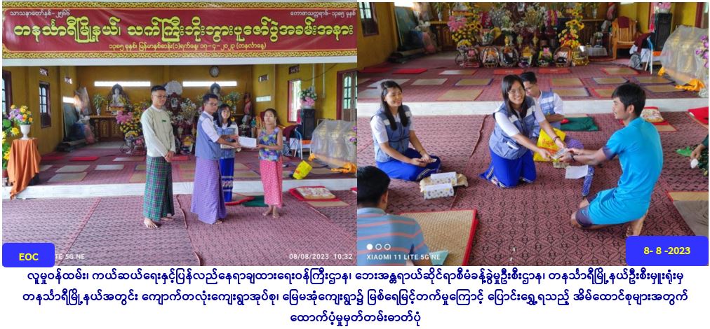 လူမှုဝန်ထမ်း၊ ကယ်ဆယ်ရေးနှင့်ပြန်လည်နေရာချထားရေးဝန်ကြီးဌာန၊ ဘေးအန္တရာယ်ဆိုင်ရာစီမံခန့်ခွဲမှု ဦးစီးဌာန၊ တနင်္သာရီမြို့နယ်ဦးစီးမှူးရုံးမှ တာဝန်ရှိသူများသည် တနင်္သာရီမြို့နယ်အတွင်း မိုးအဆက်မပြတ် ရွာသွန်းမှုကြောင့် မြစ်ရေမြင့်တက်လာပြီး ကျောက်တလုံးကျေးရွာအုပ်စု၊ မြေမအုံကျေးရွာ၌ ပြောင်းရွှေ့ ရသည့် အိမ်ထောင်စု (၁၈)စု၊ လူဦးရေ (၉၁)ဦးအတွက် ဆန်ဖိုး (၇)ရက်စာ ထောက်ပံ့ငွေ (၁၉၁၁၀၀/-) ကျပ်၊ ဆင်ခြေဖုန်းကျေးရွာအုပ်စု၊ ဘန်းသဲကျေးရွာအိမ်ထောင်စု (၂၂)စု လူဦးရေ (၁၁၆)ဦး ဆန်ဖိုး (၇) ရက်စာ ထောက်ပံ့ငွေ (၂၄၃၆၀၀/-)ကျပ်၊ ချောင်းငယ်ရပ်ကွက်အိမ်ထောင်စု (၃)စု လူဦးရေ (၁၃)ဦး အတွက် ဆန်ဖိုး (၇)ရက်စာ ထောက်ပံ့ငွေ (၂၇၃၀၀)ကျပ် စုစုပေါင်း (၂၂ဝ)ဦးအတွက် ဆန်ဖိုး(၇)ရက်စာ ထောက်ပံ့ငွေ (၄၆၂၀၀၀/-)ကျပ်အား (၈.၈.၂၀၂၃)ရက် နေ့(၁၁း၃ဝ)အချိန်တွင် ထောက်ပံ့ပေးခဲ့ကြောင်း သတင်းရရှိပါသည်။