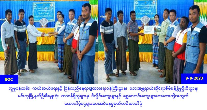 လူမှုဝန်ထမ်း၊ ကယ်ဆယ်ရေးနှင့် ပြန်လည်နေရာချထားရေးဝန်ကြီးဌာန၊ ဘေးအန္တရာယ်ဆိုင်ရာစီမံခန့်ခွဲမှု ဦးစီးဌာန၊ ပဲခူးတိုင်းဒေသကြီး၊ သာယာဝတီခရိုင်၊ မင်းလှမြို့နယ်ဦးစီးမှူးရုံးမှ တာဝန်ရှိသူများသည် မင်းလှမြို့နယ်၊ ဒီလှိုင်းကျေးရွာအုပ်စု/ရွာနှင့် ရွှေလောင်းကျေးရွာအုပ်စု/ရွာတို့၌ (၈-၈-၂၀၂၃)ရက်နေ့ (၀၈:၀၀) နာရီအချိန်တွင် ဖြစ်ပွားခဲ့သော လေဘေးကြောင့် အမိုးလန်ဘုန်းတော်ကြီးကျောင်း (၁) ကျောင်းနှင့် အမိုးလန် လူနေအိမ် (၆)လုံးတို့အတွက် ကျောင်း/အိမ်ဆောက်ပစ္စည်းဖိုးထောက်ပံ့ငွေ (၃၅၀,၀၀ဝ/-) လူဦးရေ (၁၁)ဦးတို့အတွက် ဆန်ရိက္ခာဖိုးထောက်ပံ့ငွေ (၂၃,၁၀ဝ/-)၊ စုစုပေါင်း ထောက်ပံ့ငွေ (၃၇၃,၁၀ဝ/-) ကျပ်တို့အား (၉-၈-၂၀၂၃)ရက်နေ့၊(၁၅:၀၀)နာရီအချိန်တွင် မြို့နယ်မှ တာဝန်ရှိသူများနှင့်အတူ မြို့နယ်ထွေ/အုပ်အစည်းအဝေးခန်းမ၌ ဘေးသင့်ပြည်သူလက်ဝယ်အရောက် ထောက်ပံ့ပေးအပ်ခဲ့ ကြောင်း သတင်းရရှိပါသည်။