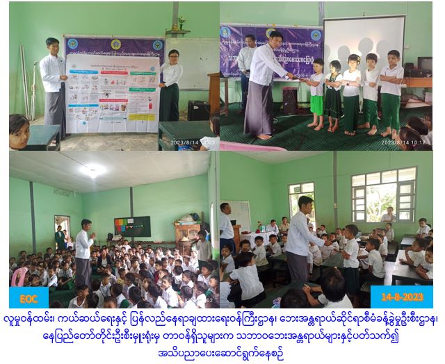 လူမှုဝန်ထမ်းကယ်ဆယ်ရေးနှင့်ပြန်လည်နေရာချထားရေးဝန်ကြီးဌာန၊ ဘေးအန္တရာယ်ဆိုင်ရာစီမံခန့်ခွဲမှုဦးစီးဌာန၊ ပြည်ထောင်စုနယ်မြေ၊ နေပြည်တော်တိုင်းဦးစီးမှူးရုံးမှ တာဝန်ရှိသူများသည် (၁၄-၈-၂၀၂၃)ရက်နေ့၊ (၀၉း၃၀)အချိန်မှ (၁၁း၃၀)အချိန်ထိ ပုဗ္ဗသီရိမြို့နယ်၊ အ.ထ.က(အောင်သုခ)စာသင်ကျောင်း၌ ကျောင်းသား/ သူ (၁၀၀)ဦးနှင့် (၁၃း၀၀)အချိန်မှ (၁၄း၃၀)အချိန်ထိ၊ ညောင်ပင်ကြီးစုကျေးရွာ(မူလွန်)စာသင်ကျောင်း၌ ကျောင်းသား/ သူ(၁၀၀)ဦး တို့အား သဘာဝဘေးအန္တရာယ်များနှင့်ပတ်သတ်၍ ဆောင်ရန်/ ရှောင်ရန်အချက်များအား သိရှိလိုက်နာဆောင်ရွက်နိုင်ရေးအတွက် သဘာဝဘေးအသိပညာပေးဟောပြောပွဲကို ကျင်းပပြုလုပ်ခဲ့ပြီး သဘာဝဘေးအသိပညာပေး လက်ကမ်းစာစောင်များ၊ ဗီနိုင်းပိုစတာများ၊ ခဲတံနှင့် ဗလာစာအုပ်များ ဖြန့်ဝေပေးခဲ့ပါကြောင်း သတင်းရရှိပါသည်။