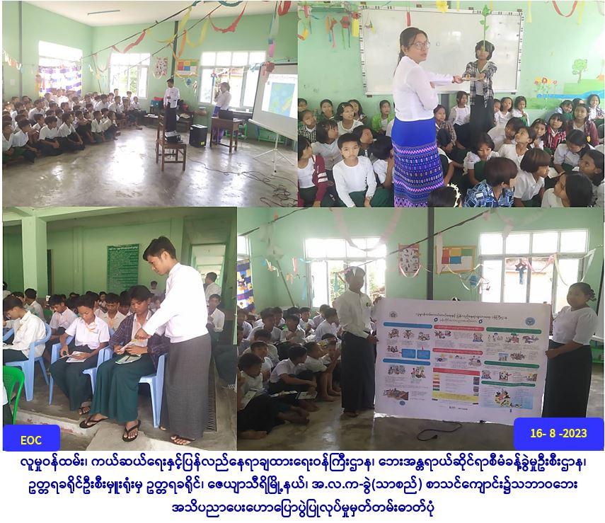 လူမှုဝန်ထမ်း၊ ကယ်ဆယ်ရေးနှင့်ပြန်လည်နေရာချထားရေးဝန်ကြီးဌာန၊ ဘေးအန္တရာယ်ဆိုင်ရာစီမံခန့်ခွဲမှု ဦးစီးဌာန၊ ဥတ္တရခရိုင်ဦးစီးမှူးရုံးမှ တာဝန်ရှိသူများသည် ပြည်ထောင်စုနယ်မြေ၊ နေပြည်တော်တိုင်းဦးစီးမှူး ရုံးမှ တာဝန်ရှိသူများနှင့် ဥတ္တရခရိုင် ဦးစီးမှူးရုံးမှ တာဝန်ရှိသူများသည် (၁၆.၈.၂၀၂၃)ရက်နေ့၊(၀၉း၃၀)အချိန်မှ (၁၁း၃၀)အချိန်ထိ ဇေယျာသီရိမြို့နယ်၊ အ.လ.က-ခွဲ(သာစည်) စာသင်ကျောင်း၌ ကျောင်းသား/သူ (၁၅၀)ဦး၊ (၁၃း၀၀)အချိန်မှ (၁၄း၃၀)အချိန်ထိ၊ အ.ထ.က(ပြည်စံအောင်) စာသင် ကျောင်းတွင် ကျောင်းသား/သူ (၁၇၀)ဦးစုစုပေါင်း ကျောင်းသား/သူ (၃၂၀)ဦးတို့အား သဘာဝဘေး အန္တရာယ်များနှင့်ပတ်သက်၍ အသိပညာပေးဟောပြောဆွေးနွေးခြင်း၊ သဘာဝဘေးအသိပညာပေး လက်ကမ်းစာစောင်များ၊ ဗွီနိုင်းပိုစတာများ၊ ဘောလ်ပင်၊ ခဲတံနှင့် ဗလာစာအုပ်များ ဖြန့်ဝေပေးခဲ့ပါကြောင်း သတင်းရရှိပါသည်။