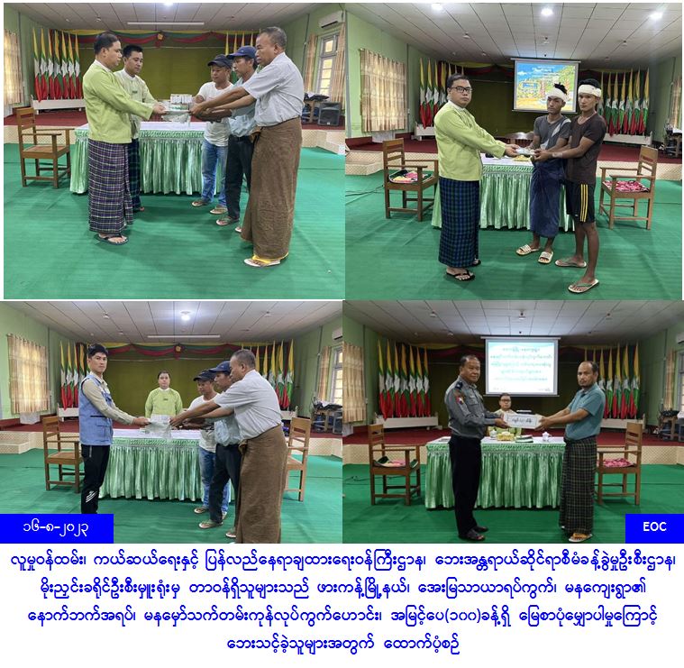 လူမှုဝန်ထမ်း၊ ကယ်ဆယ်ရေးနှင့် ပြန်လည်နေရာချထားရေးဝန်ကြီးဌာန၊ ဘေးအန္တရာယ်ဆိုင်ရာစီမံခန့်ခွဲမှုဦးစီးဌာန၊ မိုးညှင်းခရိုင်ဦးစီးမှူးရုံးမှ တာဝန်ရှိသူများသည် မိုးညှင်းခရိုင်၊ ဖားကန့်မြို့နယ်၊ အေးမြသာယာရပ်ကွက်၊ မနကျေးရွာ၏ နောက်ဘက်အရပ်၊ မနမှော်သက်တမ်းကုန်လုပ်ကွက်ဟောင်း၊ အမြင့်ပေ(၁၀၀)ခန့်ရှိ မြေစာပုံသည် ရာသီဥတုအခြေအနေကြောင့် မျှောပါခဲ့ပြီး (၁၅-၈-၂၀၂၃) ရက်နေ့ (၁၇:၀၀) အချိန်ထိ ကိုယ်ရေးအချက်အလက်အချို့ စိစစ်သိရှိရသည့် ရေမဆေးကျောက်ရှာဖွေသူ (၁၈)ဦး သေဆုံးလျက်ရှာဖွေတွေ့ရှိခဲ့ပါသည်။ အဆိုပါရှာဖွေတွေ့ရှိသေဆုံးသူ(၁၈)ဦးတို့အတွက်(၁)ဦးလျှင် (၃၀၀,၀၀ဝိ/-)နှုန်းဖြင့် ထောက်ပံ့ငွေ(၅,၄၀၀,၀၀ဝိ/-)နှင့် ဒဏ်ရာရရှိသူ (၇)ဦးတို့အတွက် (၁)ဦးလျှင်(၅၀,၀၀ဝိ/-)နှုန်းဖြင့် ထောက်ပံ့ငွေ(၃၅၀,၀၀ဝိ/-)၊ စုစုပေါင်း ထောက်ပံ့ငွေ(၅,၇၅၀,၀၀ဝိ/-)အား (၁၆-၈-၂၀၂၃)ရက်နေ့(၁၇:၃၀)အချိန်တွင် ဖားကန့်မြို့နယ် စုပေါင်းရုံး၌ မြို့နယ်စီမံအုပ်ချုပ်ရေးအဖွဲ့၊ ဥက္ကဌနှင့် တာဝန်ရှိသူများ၊ အေးမြ သာယာရပ်ကွက်၊ မနကျေးရွာတာဝန်ရှိသူများနှင့်အတူ ဘေးသင့်ပြည်သူ၊ မိသားစုဝင်များထံသို့ လက်ဝယ်အရောက် ထောက်ပံ့ခဲ့ပြီးဖြစ်ပါကြောင်း သိရှိရပါသည်။