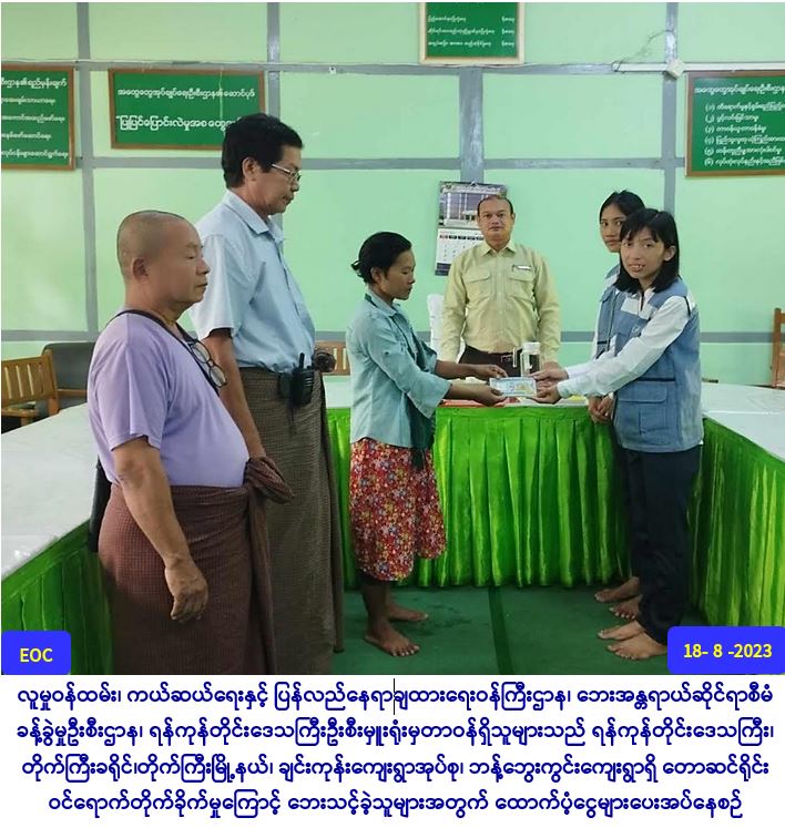 လူမှုဝန်ထမ်း၊ ကယ်ဆယ်ရေးနှင့် ပြန်လည်နေရာချထားရေးဝန်ကြီးဌာန၊ ဘေးအန္တရာယ်ဆိုင်ရာစီမံခန့်ခွဲမှု ဦးစီးဌာန၊ ရန်ကုန်တိုင်းဒေသကြီးဦးစီးမှူးရုံးမှ တာဝန်ရှိသူများသည် တိုက်ကြီးမြို့နယ်အထွေထွေ အုပ်ချုပ်ရေးဦးစီးဌာနမှ တာဝန်ရှိသူများနှင့်အတူ (၇-၈-၂၀၂၃) ရက်နေ့ (၁၃:၀၀)အချိန်ခန့်တွင် ရန်ကုန်တိုင်းဒေသကြီး၊ တိုက်ကြီးခရိုင်၊ တိုက်ကြီးမြို့နယ်၊ ချင်းကုန်းကျေးရွာအုပ်စု၊ ဘန့်ဘွေးကွင်း ကျေးရွာရှိ တောဆင်ရိုင်းဝင်ရောက်တိုက်ခိုက်မှုကြောင့် သေဆုံးခဲ့သည့် သေဆုံးသူ(၁)ဦးအတွက် သေဆုံး ထောက်ပံ့ငွေ (၃၀၀,၀၀ဝိ/-)အား (၁၈-၈-၂၀၂၃)ရက်နေ့(၁၂:၃၀)အချိန်နာရီတွင် ပြည်သူများ၏ လက်ဝယ် အရောက်ထောက်ပံ့ ပေးအပ်ခဲ့ပါကြောင်း သတင်းရရှိပါသည်။