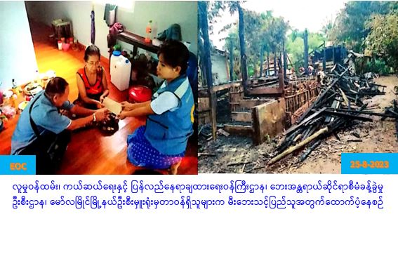 လူမှုဝန်ထမ်း၊ကယ်ဆယ်ရေးနှင့်ပြန်လည်နေရာချထားရေးဝန်ကြီးဌာန၊ ဘေးအန္တရာယ်ဆိုင်ရာစီမံခန့်ခွဲမှုဉီးစီးဌာန၊ မော်လမြိုင်မြို့နယ်ဦးစီးမှူးရုံးမှတာဝန်ရှိသူများသည် (၁၇-၈-၂၀၂၃)ရက်နေ့(၂၁း၃၀)နာရီအချိန်တွင် မော်လမြိုင်မြို့နယ်၊ မုပွန်ရပ်ကွက်၌ မီးလောင်မှုကြောင့် တစ်စိတ်တစ်ပိုင်းပျက်စီးခဲ့သည့်လူနေအိမ်(၁)လုံးအတွက် အိမ်ဆောက်ပစ္စည်းဖိုးထောက်ပံ့ငွေ (၅၀၀၀၀/-)နှင့် လူဦးရေ(၁)ဦးအတွက် (၇)ရက်စာဆန်ရိက္ခာဖိုးထောက်ပံ့ငွေ(၂၁၀၀/-)၊ စုစုပေါင်းထောက်ပံ့ငွေ(၅၂၁၀၀/-)အား (၁၈-၈-၂၀၂၃)ရက်နေ့(၁၂:၀၀)နာရီအချိန်တွင် ဘေးသင့်ပြည်သူများလက်ဝယ်အရောက် ထောက်ပံ့ပေးအပ်ခဲ့ပါကြောင်း သတင်းရရှိပါသည်၊၊