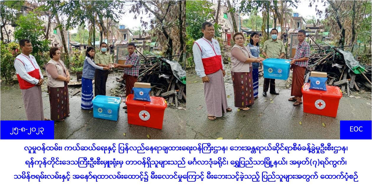 လူမှုဝန်ထမ်း၊ ကယ်ဆယ်ရေးနှင့် ပြန်လည်နေရာချထားရေးဝန်ကြီးဌာန၊ ဘေးအန္တရာယ်ဆိုင်ရာစီမံခန့်ခွဲမှုဦးစီးဌာန၊ ရန်ကုန်တိုင်းဒေသကြီးဦးစီးမှူးရုံးမှ တာဝန်ရှိသူများသည် ရန်ကုန်တိုင်းဒေသကြီး၊ မင်္ဂလာဒုံခရိုင်၊ ရွှေပြည်သာမြို့နယ်၊ အမှတ်(၇)ရပ်ကွက်၊ သမိန်ဗရမ်းလမ်းနှင့် အနော်ရထာလမ်းထောင့်ရှိ နေအိမ်၌ (၁၉-၈-၂၀၂၃) ရက်နေ့၊ (၁၂:၅၅)အချိန်ခန့်တွင် လျှပ်စစ်ဒယ်နီအိုး တည်ထားရာမှအပူလွန်ကဲ၍ အနီးရှိ နေအိမ်ပျဉ်ကာများသို့ မီးကူးစက်ကာ မီးစတင်လောင်ကျွမ်းမှုကြောင့် နေအိမ်(၃)လုံး လုံးဝပျက်စီးခဲ့ပြီး၊ အိမ်ထောင်စု(၃)စု၊ လူဦးရေ ကျား(၇)ဦး၊ မ(၈)ဦး၊ စုစုပေါင်း(၁၅)ဦးဘေးသင့်ခဲ့ရာ အဆိုပါမီးဘေးသင့်ပြည်သူများအတွက် ဆန်ရိက္ခာဖိုးထောက်ပံ့ငွေ(၃၁,၅၀ဝိ/-)၊ အိမ်ဆောက်ပစ္စည်းဖိုးထောက်ပံ့ငွေ(၆၀၀,၀၀ဝိ/-)၊ စုစုပေါင်းထောက်ပံ့ငွေ (၆၃၁,၅၀ဝိ/-)နှင့် ကယ်ဆယ်ရေးပစ္စည်း(၁၆)မျိုး အိမ်ထောင်စု(၃)စာတို့အား (၂၅-၈-၂၀၂၃)ရက်နေ့၊ (၁၁:၀၀)နာရီအချိန်တွင် ရွှေပြည်သာမြို့နယ်အထွေထွေအုပ်ချုပ်ရေးဦးစီးဌာနမှ တာဝန်ရှိသူများနှင့်အတူ ပြည်သူများ၏ လက်ဝယ်အရောက်ထောက်ပံ့ပေးအပ်ခဲ့ကြောင်း သတင်းရရှိပါသည်။