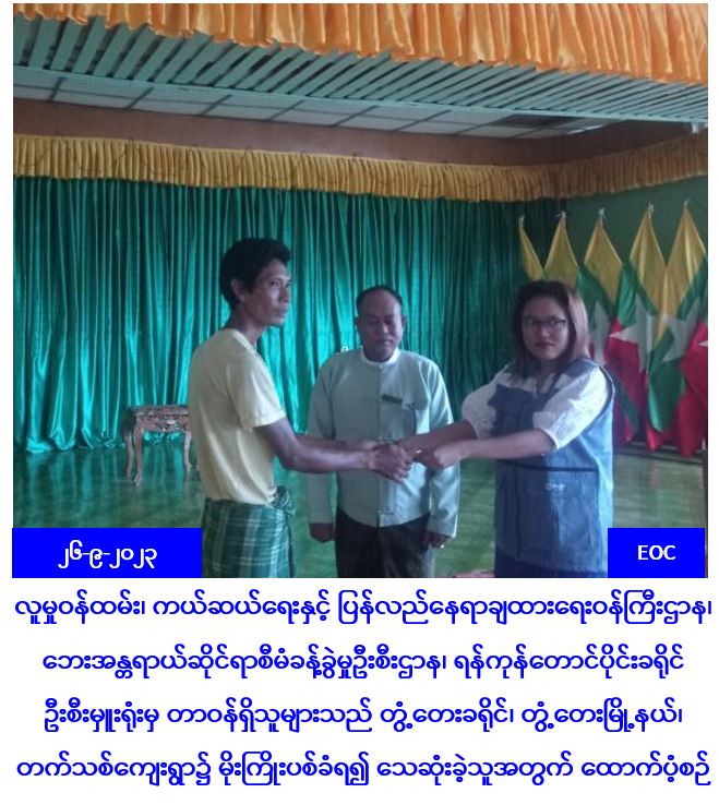လူမှုဝန်ထမ်း၊ ကယ်ဆယ်ရေးနှင့် ပြန်လည်နေရာချထားရေးဝန်ကြီးဌာန၊ ဘေးအန္တရာယ်ဆိုင်ရာစီမံခန့်ခွဲမှုဦးစီးဌာန၊ ရန်ကုန်တောင်ပိုင်းခရိုင်ဦးစီးမှူးရုံးမှ တာဝန်ရှိသူများသည် တွံ့တေးခရိုင်၊ တွံ့တေးမြို့နယ်၊ တက်သစ်ကျေးရွာ၌ (၂၃-၉-၂၀၂၃) ရက်နေ့၊ (၁၆:၃၀) နာရီအချိန်တွင် မိုးကြိုးပစ်ခံရ၍ သေဆုံးခဲ့သူ (၁) ဦးအတွက် ထောက်ပံ့ငွေ (၃၀၀၀၀ဝိ/-) တိတိအား သေဆုံးသူမိသားစုဝင်၏ လက်ဝယ်အရောက် (၂၆-၉-၂၀၂၃) ရက်နေ့၊ နံနက် (၁၁:၀၀) နာရီအချိန်တွင် သွားရောက်ထောက်ပံ့ပေးအပ်ခဲ့ကြောင်း သတင်းရရှိပါသည်။