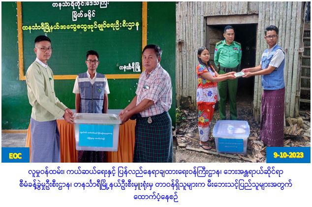 လူမှုဝန်ထမ်း၊ ကယ်ဆယ်ရေးနှင့် ပြန်လည်နေရာချထားရေးဝန်ကြီးဌာန၊ ဘေးအန္တရာယ်ဆိုင်ရာစီမံခန့်ခွဲမှုဦးစီးဌာန၊ တနင်္သာရီမြို့နယ်ဦးစီးမှူးရုံးမှ တာဝန်ရှိသူများသည် (၆-၁၀-၂၀၂၃)ရက်နေ့(၁၅း၁၅)ချိန်တွင် တနင်္သာရီမြို့၊ နိဗ္ဗာန်လမ်း၌ မီးလောင်ကျွမ်းမှုကြောင့် မီးဘေးသင့်ခဲ့သည့် ဓနိမိုး၊ ဝါးထရံကာ၊ ပျဉ်ခင်း၊ လုံးဝပျက်စီး နေအိမ်(၁)လုံးအတွက် အိမ်ဆောက်ပစ္စည်းဖိုးထောက်ပံ့ငွေ (၁၀၀၀၀၀ိ/-)ကျပ် လူဦးရေ(၂)ဦးအတွက် (၇)စာ ဆန်ရိက္ခာဖိုးထောက်ပံ့ငွေ (၄၂၀၀ိ/-)ကျပ်နှင့် ဘေးသင့်အိမ်ထောင်စု(၁)စုအတွက် (၄၅၉၀၀ိ/-)ကျပ်တန်ဖိုးရှိသော ကယ်ဆယ်ရေးပစ္စည်း(၁၆)မျိုးပါ ပလပ်စတစ်ပုံးတို့အား (၉-၁၀-၂၀၂၃)ရက်နေ့ (၁၄း၀၀)အချိန်တွင် ဘေးသင့်ပြည်သူများလက်ဝယ်အရောက် သွားရောက်ထောက်ပံ့ပေးအပ်ခဲ့ပါကြောင်း သတင်းရရှိပါသည်။