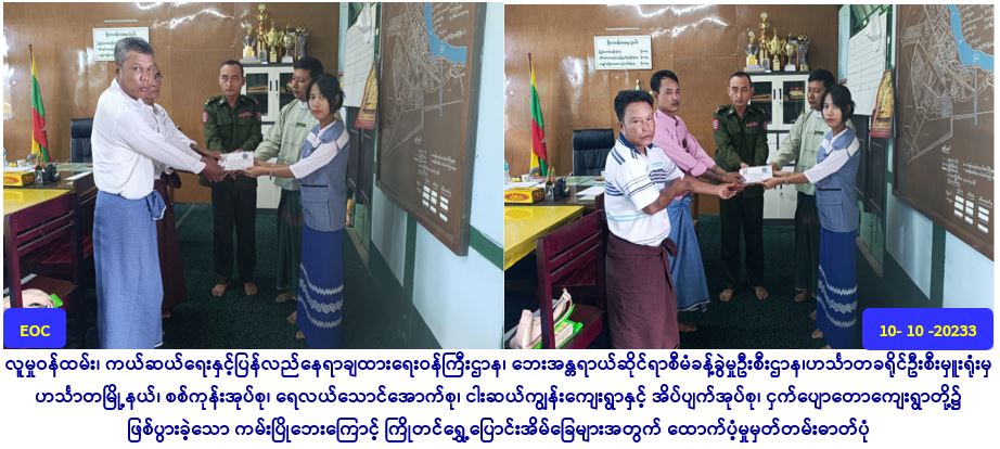 လူမှုဝန်ထမ်း၊ ကယ်ဆယ်ရေးနှင့်ပြန်လည်နေရာချထားရေးဝန်ကြီးဌာန၊ ဘေးအန္တရာယ်ဆိုင်ရာစီမံခန့်ခွဲမှု ဦးစီးဌာန၊ ဟင်္သာတခရိုင်ဦးစီးမှူးရုံးမှ တာဝန်ရှိသူများသည် (၂၈.၉.၂၀၂၃)ရက်နေ့မှ (၅.၁၀.၂၀၂၃)ရက်နေ့ အတွင်း ဟင်္သာတမြို့နယ်၊ စစ်ကုန်းအုပ်စု၊ ရေလယ်သောင်အောက်စု၊ ငါးဆယ်ကျွန်းကျေးရွာနှင့် အိပ်ပျက်အုပ်စု၊ ငှက်ပျောတောကျေးရွာတို့တွင်ဖြစ်ပွားခဲ့သော ကမ်းပြို ဘေးကြောင့် ကြိုတင်ရွှေ့ပြောင်း အိမ်ခြေ (၁၉)လုံးအတွက် အိမ်ဆောက်ပစ္စည်းဖိုးငွေ (၁,၉၀၀,၀၀၀ိ/-)ကျပ်၊ လူဦးရေ (၇၁)ဦး အတွက် ဆန်ရိက္ခာဖိုးငွေ (၁၄၉,၁၀၀ိ/-)ကျပ်၊ စုစုပေါင်းထောက်ပံ့ငွေ (၂,၀၄၉,၁၀၀ိ/-) ကျပ်တို့အား (၁၀-၁၀-၂၀၂၃)ရက်နေ့ (၁၃:၀၀)အချိန်တွင် မြို့နယ်စီမံအုပ်ချုပ်ရေးအဖွဲ့၊ တာဝန်ရှိသူများနှင့်အတူ ဘေးသင့်ပြည်သူများ လက်ဝယ်အရောက် ထောက်ပံ့ ပေးအပ်ခဲ့ပါကြောင်း သတင်းရရှိပါသည်။