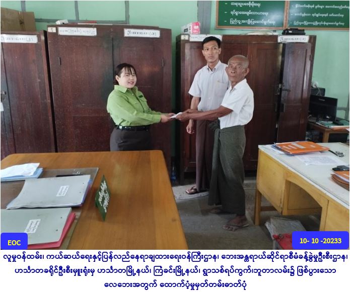 လူမှုဝန်ထမ်း၊ ကယ်ဆယ်ရေးနှင့်ပြန်လည်နေရာချထားရေးဝန်ကြီးဌာန၊ ဘေးအန္တရာယ်ဆိုင်ရာစီမံခန့်ခွဲမှု ဦးစီးဌာန၊ ဟင်္သာတခရိုင်ဦးစီးမှူးရုံးမှ တာဝန်ရှိသူများသည် ဟင်္သာတမြို့နယ်၊ ကြံခင်းမြို့နယ်၊ ရွာသစ် ရပ်ကွက်၊ ဘူတာလမ်းတွင် (၄-၁၀-၂၀၂၃) ရက်နေ့ ဖြစ်ပွားခဲ့သော လေဘေးကြောင့် တစ်စိတ် တစ်ပိုင်းအိမ်ခြေ (၁)လုံးအတွက် အိမ်ဆောက်ပစ္စည်းဖိုးငွေ (၃၀,၀၀၀ိ/-)ကျပ်၊ လူဦးရေ (၄)အတွက် ဆန်ရိက္ခာဖိုးငွေ (၈,၄၀၀ိ/-)ကျပ်၊ စုစုပေါင်းထောက်ပံ့ငွေ (၃၈,၄၀၀ိ/-)တို့ကျပ်အား (၁၀-၁၀-၂၀၂၃) ရက်နေ့ (၁၃:၀၀) အချိန်တွင် မြို့နယ်စီမံအုပ်ချုပ်ရေးအဖွဲ့၊ တာဝန်ရှိသူများနှင့်အတူ ဘေးသင့်ပြည်သူများ လက်ဝယ်အရောက် ထောက်ပံ့ပေးအပ်ခဲ့ ပါကြောင်း သတင်းရရှိပါသည်။
