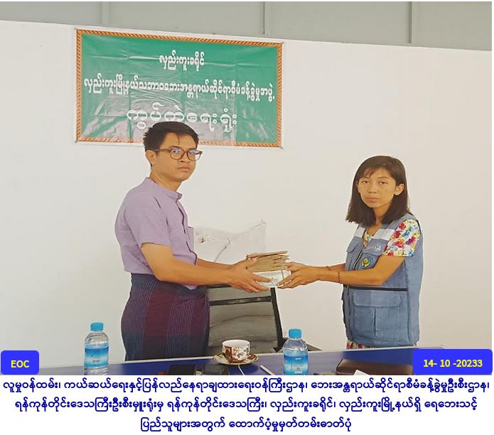 လူမှုဝန်ထမ်း၊ ကယ်ဆယ်ရေးနှင့်ပြန်လည်နေရာချထားရေးဝန်ကြီးဌာန၊ ဘေးအန္တရာယ်ဆိုင်ရာစီမံခန့်ခွဲမှု ဦးစီးဌာန၊ ရန်ကုန်တိုင်းဒေသကြီးဦးစီးမှူးရုံးတို့မှ တာဝန်ရှိသူများသည် ရန်ကုန်တိုင်းဒေသကြီး၊ လှည်းကူး ခရိုင်၊ လှည်းကူးမြို့နယ်တွင် (၁၁-၁၀-၂၀၂၃) ရက်နေ့မှ (၁၂-၁၀-၂၀၂၃) ရက်နေ့အတွင်း ငမိုးရိပ် ချောင်းရေမြင့်တက်မှုနှင့် မိုးဆက်လက်ရွာသွန်းမှုကြောင့် ရပ်ကွက်/ကျေးရွာ အုပ်စုများရှိ ကယ်ဆယ်ရေး စခန်းများသို့ ထပ်တိုးရောက်ရှိလာသည့် အိမ်ခြေ (၈၇၈)လုံး၊ အိမ်ထောင်စု (၈၇၈)စုမှ လူဦးရေ (၃၆၂၂)ဦးအတွက် ဆန်ရိက္ခာဖိုးထောက်ပံ့ငွေစုစုပေါင်း (၇,၆၀၆,၂၀ဝိ/-) အား (၁၄-၁၀-၂၀၂၃)ရက်နေ့ (၀၉:၃၀)အချိန်နာရီတွင် လှည်းကူးမြို့နယ်သဘာဝဘေးစီမံခန့်ခွဲမှုကွပ်ကဲရေးရုံးသို့ သွားရောက်ထောက်ပံ့ ခဲ့ပါကြောင်း သတင်းရရှိပါသည်။