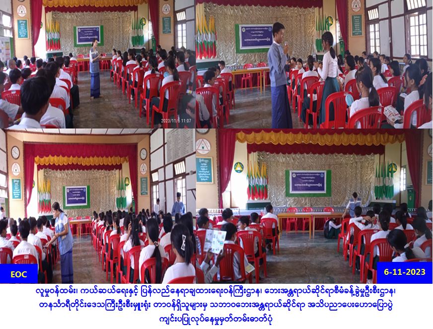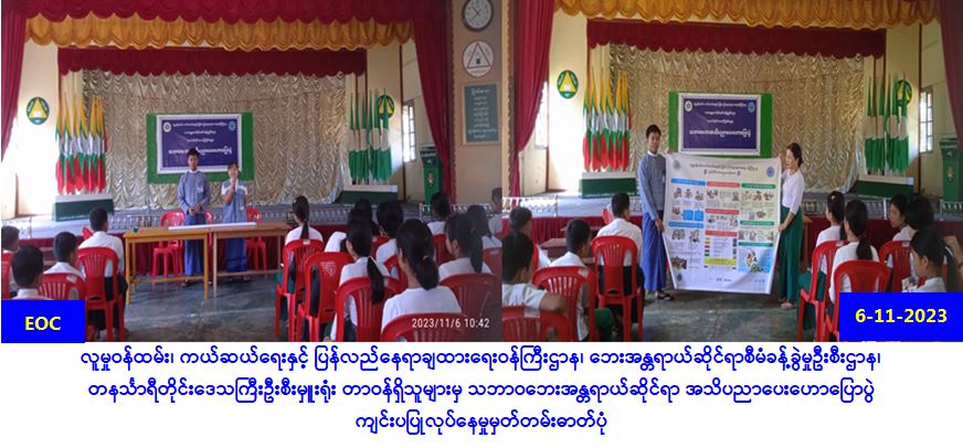 လူမှု၀န်ထမ်း၊ ကယ်ဆယ်ရေးနှင့် ပြန်လည်နေရာချထားရေး၀န်ကြီးဌာန၊ ဘေးအန္တရာယ်ဆိုင်ရာစီမံခန့်ခွဲမှု ဦးစီးဌာန၊ တနင်္သာရီတိုင်းဒေသကြီဦးစီးမှူးရုံးမှ တာဝန်ရှိသူများသည် (၆-၁၁-၂၀၂၃)ရက်နေ့ နံနက် (၁၀:၃၀)နာရီအချိန်တွင် ထားဝယ်ခရိုင်၊ ထားဝယ်မြို့နယ်၊ အ.ထ.က (၂)မှ ကျောင်းသား/သူ (၁၀၀)ဦး ခန့်အား သဘာဝဘေးအန္တရာယ်များနှင့်ပတ်သက်၍ အသိပညာပေးဟောပြောခြင်း၊ အသိပညာပေး လက်ကမ်းစာစောင်များနှင့် ဗွီနိုင်းပိုစတာဖြန့်ဝေပေးခြင်းများ ဆောင်ရွက်ခဲ့ပါကြောင်း သတင်းရရှိပါ သည်။