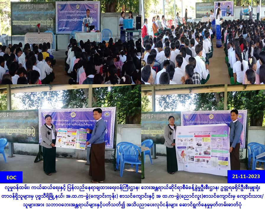 လူမှုဝန်ထမ်း၊ ကယ်ဆယ်ရေးနှင့် ပြန်လည်နေရာချထားရေးဝန်ကြီးဌာန၊ ဘေးအန္တရာယ်ဆိုင်ရာစီမံခန့်ခွဲမှုဦးစီး ဌာန၊ ပြည်ထောင်စုနယ်မြေ၊ နေပြည်တော်၊ ဥတ္တရခရိုင်ဦးစီးမှူးရုံးမှ တာဝန်ရှိသူများသည် (၂၁-၁၁-၂၀၂၃)ရက်နေ့ ၊(၀၉:၃၀)အချိန်မှ (၁၁:၃၀)အချိန်ထိ ပုဗ္ဗသီရိမြို့နယ်၊ အ.ထ.က-ခွဲ(ကျောင်းကုန်း) စာသင်ကျောင်း၌ ကျောင်းသား/ သူ (၄၅၀)ဦးနှင့် (၁၃:၀၀)အချိန်မှ (၁၄:၃၀)နာရီအချိန်ထိ အ ထ.က-ခွဲ(ညောင်လူး)စာသင်ကျောင်း၌ ကျောင်းသား/ သူ(၂၀၀)ဦး စုစုပေါင်း ကျောင်းသား/သူ (၆၅၀)ဦးတို့အား သဘာဝဘေးအန္တရာယ်များနှင့်ပတ်သတ်၍ ဆောင်ရန်/ ရှောင်ရန် အချက်များအား သိရှိလိုက်နာဆောင်ရွက်နိုင်ရေးအတွက် သဘာဝဘေးအသိပညာပေးဟောပြောပွဲကို ကျင်းပပြုလုပ်ခဲ့ပြီး အဆိုပါဟောပြောပွဲတွင် သဘာဝဘေးအသိပညာပေး လက်ကမ်းစာစောင်များ ဝေငှခြင်း၊ ဗီနိုင်း ပိုစတာများပေးအပ်ခြင်း၊ ဘောလ်ပင်၊ ခဲတံနှင့် ဗလာစာအုပ်များ ဝေငှပေးအပ်ခဲ့ပါကြောင်း သတင်းရရှိပါသည်။