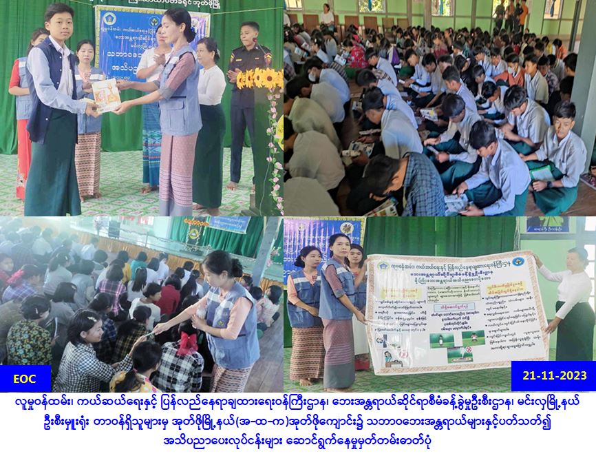 လူမှုဝန်ထမ်း၊ ကယ်ဆယ်ရေးနှင့် ပြန်လည်နေရာချထားရေးဝန်ကြီးဌာန၊ ဘေးအန္တရာယ်ဆိုင်ရာစီမံခန့်ခွဲမှု ဦးစီးဌာန၊ ပဲခူးတိုင်းဒေသကြီး၊ သာယာဝတီခရိုင်၊ မင်းလှမြို့နယ်ဦးစီးမှူးရုံးမှ တာဝန်ရှိသူများသည် (၂၁-၁၁-၂၀၂၃)ရက်နေ့၊ (၀၉:၀၀)အချိန်မှ (၁၁:၀၀)နာရီအချိန်အထိ အုတ်ဖိုမြို့နယ်(အ-ထ-က)အုတ်ဖို ကျောင်း၌ ဆရာ/ဆရာမများနှင့် ကျောင်းသား/သူ အင်အား (၁၅၀)ဦးခန့်တို့အား သဘာဝဘေးအန္တရာယ် နှင့်စပ်လျဉ်း၍ ဆောင်ရန်/ရှောင်ရန်အချက်များကို အသိပညာပေး သရုပ်ပြဆွေးနွေးဟောပြောခြင်း၊ ဘောပင်နှင့် လက်ကမ်းစာစောင်များ ဝေငှပေးခြင်း၊ အမေးအဖြေများပြုလုပ်ဆွေးနွေးပြီး ဗလာစာအုပ်များ ဝေငှပေးခြင်း၊ ကျောင်းအုပ်ဆရာမကြီးထံသို့ မိုးကြိုးဘေး ဗီနိုင်းနှင့် ငလျင်ဘေး ပိုစတာပေးအပ်ခြင်းများ ဆောင်ရွက်ခဲ့ရာ အဆိုပါဆွေးနွေးဟောပြောပွဲသို့ မီးသတ်ဦးစီးဌာန၊ ပြန်ဆက်ဦးစီးဌာနတို့မှ ပူးပေါင်း ပါဝင်ဆွေးနွေးခဲ့ပါကြောင်း သတင်းရရှိပါသည်။