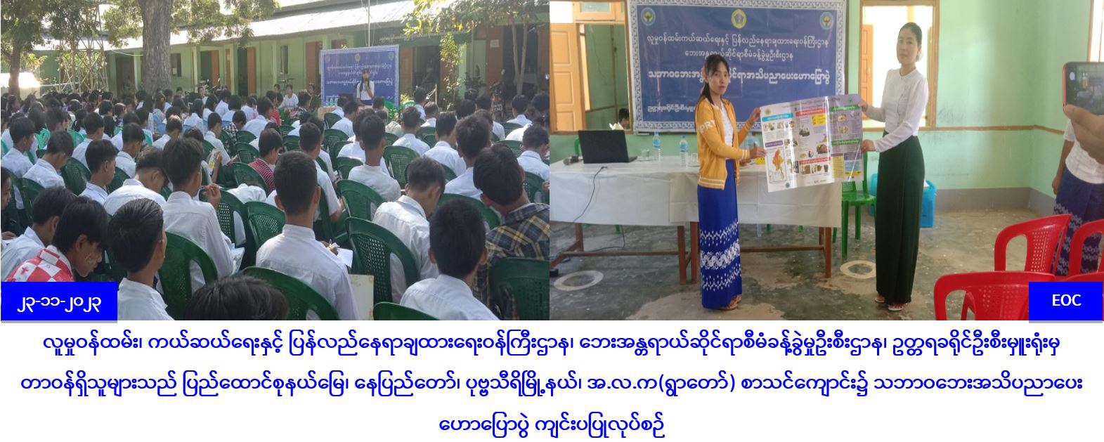 လူမှုဝန်ထမ်း၊ ကယ်ဆယ်ရေးနှင့် ပြန်လည်နေရာချထားရေးဝန်ကြီးဌာန၊ ဘေးအန္တရာယ်ဆိုင်ရာစီမံခန့်ခွဲမှုဦးစီးဌာန၊ ပြည်ထောင်စုနယ်မြေ၊ နေပြည်တော်၊ ဥတ္တရခရိုင်ဦးစီးမှူးရုံးမှ တာဝန်ရှိသူများသည် (၂၃-၁၁-၂၀၂၃)ရက်နေ့၊ (၁၃း၀၀)အချိန်မှ (၁၄း၃၀)အချိန်ထိ ပုဗ္ဗသီရိမြို့နယ်၊ အ.လ.က(ရွာတော်)စာသင်ကျောင်း၌ ကျောင်းသား/ သူ(၂၀၀)ဦးတို့အား သဘာဝဘေးအန္တရာယ်များနှင့်ပတ်သတ်၍ ဆောင်ရန်/ ရှောင်ရန် အချက်များအား သိရှိလိုက်နာဆောင်ရွက်နိုင်ရေးအတွက် သဘာဝဘေးအသိပညာပေးဟောပြောပွဲကို ကျင်းပပြုလုပ်ခဲ့ပြီး အဆိုပါဟောပြောပွဲတွင် သဘာဝဘေးအသိပညာပေး လက်ကမ်းစာစောင်များ၊ ဗီနိုင်းပိုစတာများ၊ ဘောလ်ပင်၊ ခဲတံနှင့် ဗလာစာအုပ်များ ဖြန့်ဝေပေးခဲ့ကြောင်း သတင်းရရှိပါသည်။