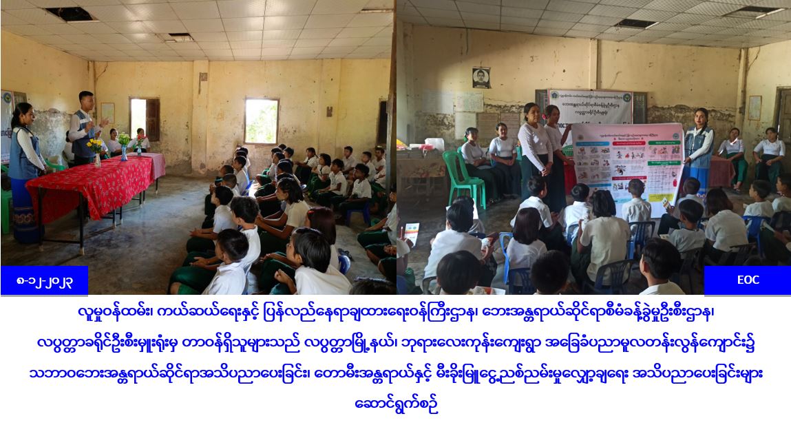 လူမှုဝန်ထမ်း၊ ကယ်ဆယ်ရေးနှင့် ပြန်လည်နေရာချထားရေးဝန်ကြီးဌာန၊ ဘေးအန္တရာယ်ဆိုင်ရာစီမံခန့်ခွဲမှုဦးစီးဌာန၊ လပွတ္တာခရိုင်ဦးစီးမှူးရုံးမှ တာဝန်ရှိသူများသည် (၈-၁၂-၂၀၂၃)ရက်နေ့၊ နံနက်(၁၀:၀၀)နာရီအချိန်မှ (၁၂:၀၀)နာရီအချိန်အထိ လပွတ္တာမြို့နယ်၊ ဘုရားလေးကုန်းကျေးရွာ အခြေခံပညာမူလတန်းလွန်ကျောင်း၌ ကျောင်းသား/ကျောင်းသူ(၁၅၀)ဦးခန့်အား သဘာဝဘေးအန္တရာယ်ဆိုင်ရာအသိပညာပေးခြင်း၊ တောမီးအန္တရာယ်နှင့် မီးခိုးမြူငွေ့ညစ်ညမ်းမှုလျှော့ချရေးအသိပညာပေးခြင်းများ ဆောင်ရွက်ခဲ့ပြီး လက်ကမ်းစာစောင်များ၊ ဗီနိုင်းနှင့် စာရေးကိရိယာများ ဝေငှခြင်းတို့ ဆောင်ရွက်ခဲ့ကြောင်း သတင်းရရှိပါသည်။