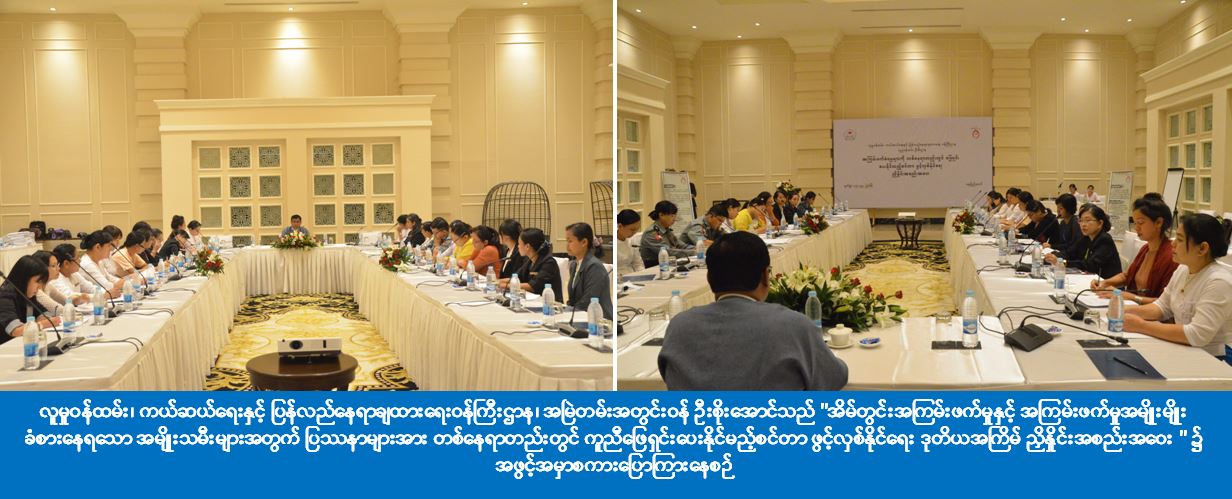 စင်တာအား လူမှုဝန်ထမ်းဦးစီးဌာနလက်အောက်ရှိ ရန်ကုန်မြို့၊ အမျိုးသမီးသက်မွေးအတတ်ပညာသင်ကျောင်းတွင် ထူထောင်ဖွင့်လှစ်နိုင်ရေးဆောင်ရွက်ထားရှိပြီး အဆိုပါသင်တန်းကျောင်းတွင် အိမ်တွင်း အကြမ်းဖက်ခံရသော အမျိုးသမီးလေးများ၊ လူကုန်ကူးခံရသော အမျိုးသမီးများနှင့် ဥပဒေအရ ငြိစွန်းနေသော ကလေးများကို လက်ခံစောင့်ရှောက်ထားပါကြောင်း၊ ယနေ့ကျင်းပသောအစည်းအဝေးတွင် ဦးစီးဌာနမှ ပြင်ဆင်ထားသော Guide Line နှင့် TOR၊ Case Management Issue Form ပုံစံမူကြမ်းများကိုလည်း လက်တွေ့အသုံးပြုနိုင်အောင် ဝိုင်းဝန်းဖြည့်စွက်ပေးကြဖို့ကိုလည်း တိုက်တွန်းပြောကြားလိုပါကြောင်း” စသည်ဖြင့် ပြောကြားခဲ့ပါသည်။