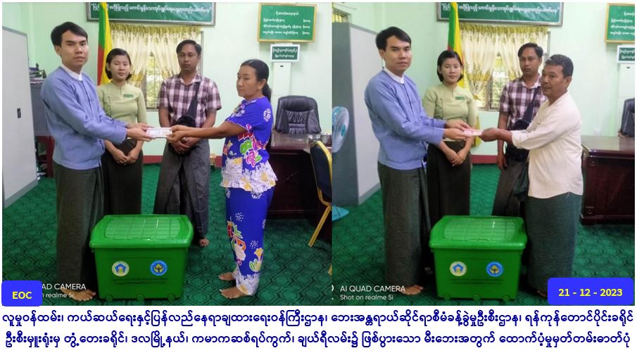 လူမှု၀န်ထမ်း၊ ကယ်ဆယ်ရေးနှင့်ပြန်လည်နေရာချထားရေးဝန်ကြီးဌာန၊ ဘေးအန္တရာယ်ဆိုင်ရာစီမံခန့်ခွဲမှု ဦးစီးဌာန ရန်ကုန်တောင်ပိုင်းခရိုင်ဦးစီးမှူးရုံးမှ တာ၀န်ရှိသူများသည် (၁၉-၁၂-၂၀၂၃) ရက်နေ့၊ (၁၄:၅၅) နာရီအချိန်ခန့်၌ တွံ့တေးခရိုင်၊ ဒလမြို့နယ်၊ ကမာကဆစ်ရပ်ကွက်၊ ချယ်ရီလမ်းရှိ (၁၀x၂၀) ပေ၊ ပျဉ်ခင်း၊ သွပ်ကာ၊ သွပ်မိုးနေအိမ်တွင် တီဗွီသို့ သွယ်တန်းထားသော မီးကြိုး သည် အပူလွန်ကဲရာမှ မီးလောင်ကျွမ်းမှုဖြစ်ပွားခဲ့သည့် နေအိမ် (၆) လုံး (လုံးဝပျက်စီး)၊ လူဦးရေ (၂၀) ဦးတို့အတွက် အိမ်ဆောက်ပစ္စည်းဖိုး (၆၀၀၀၀ဝိ/-) ၊ ဆန်ရိက္ခာဖိုး (၄၂၀၀ဝိ/-)နှင့် ကယ်ဆယ်ရေးပစ္စည်း (၁၇) မျိုး၊ ပစ္စည်းတန်ဖိုး (၃၅၈၁၂ဝိ/-)၊ စုစုပေါင်း ထောက်ပံ့ငွေ (၁၀၀၀၁၂ဝိ/-) တို့အား (၂၁-၁၂-၂၀၂၃) ရက်နေ့၊ နံနက် (၁၀း၅၀) နာရီအချိန်တွင် ပြည်သူများ၏ လက်ဝယ်အရောက် သွားရောက်ထောက်ပံ့ပေးအပ် ခဲ့ပါကြောင်း သတင်းရရှိပါသည်။