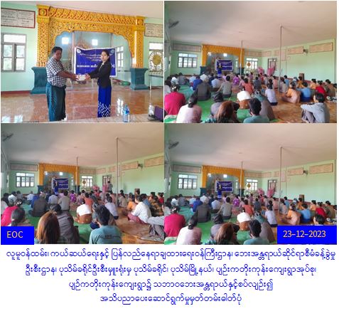 လူမှု၀န်ထမ်း၊ ကယ်ဆယ်ရေးနှင့်ပြန်လည်နေရာချထားရေး၀န်ကြီးဌာန၊ ဘေးအန္တရာယ်ဆိုင်ရာ စီမံခန့်ခွဲမှုဦးစီးဌာန၊ ပုသိမ်ခရိုင်ဦးစီးမှူးရုံးမှတာ၀န်ရှိသူများသည် ၂၀၂၃-၂၀၂၄ ဘဏ္ဍာရေးနှစ်၊ တတိယ(၃)လပတ်ကာလအတွင်း ပုသိမ်ခရိုင်၊ ပုသိမ်မြို့နယ်၊ ပျဉ်းကတိုးကုန်းကျေးရွာအုပ်စု၊ ပျဉ်ကတိုးကုန်းကျေးရွာတွင် (၂၃-၁၂-၂၀၂၃)ရက်နေ့၌ ကျေးရွာသူ/သား(၁၀၀)ဦးခန့်အား ဦးစီး ဌာန၏လုပ်ငန်းဆောင်ရွက်ချက်များ၊ ထောက်ပံ့နေမှုများ၊ သဘာ၀ဘေးအန္တရာယ်နှင့်ပတ်သက်၍ ဆောင်ရန်/ရှောင်ရန်များအား (၁၁:၃၀)နာရီအချိန်မှ (၁၂:၅၀) နာရီအချိန်ထိ ဆွေးနွေးဟောပြော ခဲ့ပြီး လက်ကမ်းစာစောင်များ ပေးအပ်ခဲ့ပါကြောင်း သတင်းရရှိပါသည်။