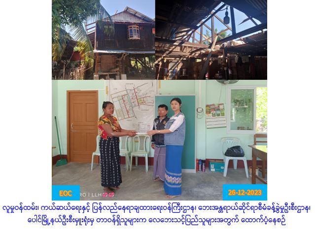 လူမှုဝန်ထမ်းကယ်ဆယ်ရေးနှင့်ပြန်လည်နေရာချထားရေးဝန်ကြီးဌာန၊ ဘေးအန္တရာယ်ဆိုင်ရာ စီမံခန့်ခွဲမှုဦးစီးဌာန၊ ပေါင်မြို့နယ်ဦးစီးမှူးရုံးမှတာဝန်ရှိသူများသည် (၂၃-၁၂-၂၀၂၃)ရက်နေ့ (၁၁း၃၀)အချိန်၌ ပေါင်မြို့နယ်၊ ဇင်းကျိုက်မြို့၊ ဇင်းကျိုက်ရပ်ကွက်တွင် လေပြင်းတိုက်ခတ်မှုကြောင့် အမိုးလန်ပျက်စီးခဲ့သည့်လူနေအိမ်(၁)လုံးအတွက် အိမ်ဆောက်ပစ္စည်းဖိုးထောက်ပံ့ငွေ(၅၀၀၀၀ိ/-)ကျပ်၊ လူဦးရေ(၈)ဦးအတွက်(၇)ရက်စာဆန်ရိက္ခာဖိုးထောက်ပံ့ငွေ(၁၆၈၀၀ိ/-)ကျပ်၊ စုစုပေါင်းထောက်ပံ့ငွေ (၆၆၈၀၀ိ/-)ကျပ်အား(၂၆-၁၂-၂၀၂၃)ရက်နေ့(၁၂း၃၀)အချိန်တွင် ဘေးသင့်ပြည်သူများလက်ဝယ်အရောက် သွားရောက်ထောက်ပံ့ခဲ့ပါကြောင်း သတင်းရရှိပါသည်။