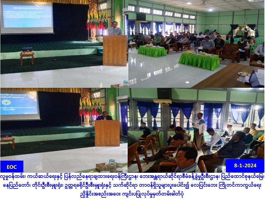 လူမှုဝန်ထမ်း၊ ကယ်ဆယ်ရေးနှင့် ပြန်လည်နေရာချထားရေးဝန်ကြီးဌာန၊ ဘေးအန္တရာယ်ဆိုင်ရာစီမံခန့်ခွဲမှု ဦးစီးဌာန၊ ဥတ္တရခရိုင်ဦးစီးမှူးရုံးမှ တာဝန်ရှိသူများသည် (၈-၁-၂၀၂၄)ရက်နေ့၊ (၁၀:၀၀)နာရီအချိန်တွင် တပ်ကုန်းမြို့၊ မြို့နယ်အထွေထွေအုပ်ချုပ်ရေးဦစီးဌာန၊ အစည်းအဝေးခန်းမ၌ လေပြင်းဘေးကြိုတင် ကာကွယ်ရေးအစည်းအဝေး ကျင်းပပြုလုပ်ခဲ့ရာ အစည်းအဝေးသို့ ဘေးအန္တရာယ်ဆိုင်ရာစီမံခန့်ခွဲမှုဦးစီး ဌာန၊ ပြည်ထောင်စုနယ်မြေ၊ နေပြည်တော်၊ တိုင်းဦးစီးမှူးရုံးမှ ညွှန်ကြားရေးမှူး၊ တပ်ကုန်းမြို့နယ်၊ မြို့နယ်အုပ်ချုပ်ရေးမှူး၊ မြို့နယ်စီမံအုပ်ချုပ်ရေးအဖွဲ့များ၊ ဌာနဆိုင်ရာများမှ သဘာဝဘေးအန္တရာယ် ဆိုင်ရာစီမံခန့်ခွဲမှုကော်မတီဝင်များနှင့် ကျေးရွာအုပ်ချုပ်ရေးမှူးများ တက်ရောက်ခဲ့ပြီး အစည်းအဝေးတွင် သက်ကြီးရွယ်အိုများ၊ မသန်စွမ်းသူများ၊ အမျိုးသမီးဦးဆောင်သောအိမ်ထောင်စုများမှ ကြံ့ခိုင်မှုမရှိသော နေအိမ်များနှင့် မဖြစ်မနေပြုပြင်ရန် လိုအပ်သောနေအိမ်များအား ပြန်လည်ပြုပြင်မွမ်းမံပြင်ဆင်ခြင်း စသည့် လေပြင်းဘေး ကြိုတင်ကာကွယ်ရေးလုပ်ငန်းများ ဆောင်ရွက်နိုင်ရန်အတွက် ဝိုင်းဝန်းဆွေးနွေး ခဲ့ပြီး (၁၁:၁၅) နာရီအချိန်တွင် အစည်းအဝေးပြီးဆုံးခဲ့ပါကြောင်း သတင်းရရှိပါသည်။