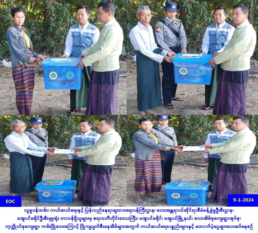 လူမှု၀န်ထမ်း၊ ကယ်ဆယ်ရေးနှင့် ပြန်လည်နေရာချထားရေး၀န်ကြီးဌာန၊ ဘေးအန္တရာယ်ဆိုင်ရာစီမံခန့်ခွဲမှု ဦးစီးဌာန၊ မအူပင်ခရိုင်ဦးစီးမှူးရုံးမှ တာဝန်ရှိသူများသည် ဧရာဝတီတိုင်းဒေသကြီး၊ မအူပင်ခရိုင်၊ မအူပင် မြို့နယ်၊ လေးအိမ်စုကျေးရွာအုပ်စု၊ ကုက္ကိုလ်စုကျေးရွာ၌ (၉-၁-၂၀၂၄)ရက်နေ့တွင် ဖြစ်ပွားခဲ့သော ကမ်းပြိုဘေးကြောင့် ပြိုကျပျက်စီးခဲ့သည့်နေအိမ် (၂)လုံး၊ အိမ်ထောင်စု (၂)စုမှ လူဦးရေ (၁၂)ဦးအတွက် ဆန်ရိက္ခာဖိုးငွေ (၇)ရက်စာ (၂၅,၂၀ဝ/-)၊ အိမ်ဆောက်ပစ္စည်းဖိုးထောက်ပံ့ငွေ (၂၀၀,၀၀ဝ/-)၊စုစုပေါင်း ထောက်ပံ့ငွေ (၂၂၅,၂၀ဝ/-)ကျပ်နှင့် ကယ်ဆယ်ရေးပစ္စည်း(၁၆)မျိုးပါ(၂)ပုံးနှင့်စက္ကူပုံး(၂)ပုံးတို့အား (၉-၁-၂၀၂၄) ရက်နေ့၊ (၁၅:၃၀)နာရီအချိန်တွင် မအူပင်မြို့နယ်အုပ်ချုပ်ရေးမှူးနှင့်အတူ ဘေးသင့် ပြည်သူများထံ ကွင်းဆင်းထောက်ပံ့ပေးအပ်ခဲ့ပါကြောင်း သတင်းရရှိပါသည်။