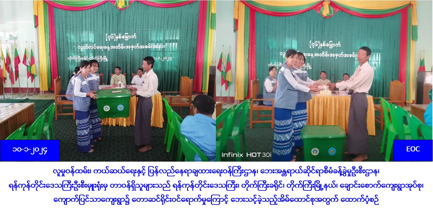 လူမှုဝန်ထမ်း၊ ကယ်ဆယ်ရေးနှင့် ပြန်လည်နေရာချထားရေးဝန်ကြီးဌာန၊ ဘေးအန္တရာယ်ဆိုင်ရာစီမံခန့်ခွဲမှုဦးစီးဌာန၊ ရန်ကုန်တိုင်းဒေသကြီးဦးစီးမှူးရုံးမှ တာဝန်ရှိသူများသည် ရန်ကုန်တိုင်းဒေသကြီး၊ တိုက်ကြီးခရိုင်၊ တိုက်ကြီးမြို့နယ်၊ ချောင်းစောက်ကျေးရွာအုပ်စု၊ ကျောက်ပြင်သာကျေးရွာ၌ (၆-၁-၂၀၂၄)ရက်နေ့၊ (၀၆:၀၀)အချိန်ခန့်တွင် တောဆင်ရိုင်းဝင်ရောက်ဖျက်ဆီးမှုကြောင့် နေအိမ်(၁)လုံး လုံးဝပျက်စီးခဲ့ပြီး၊ ဘေးသင့်အိမ်ထောင်စု(၁)စု၊ လူဦးရေ(၄)ဦးတို့အတွက် ဆန်ရိက္ခာဖိုးထောက်ပံ့ငွေ(၈,၄၀ဝိ/-)၊ အိမ်ဆောက်ပစ္စည်းဖိုးထောက်ပံ့ငွေ(၁၀၀,၀၀ဝိ/-)၊ စုစုပေါင်းထောက်ပံ့ငွေ(၁၀၈,၄၀ဝိ/-)နှင့် ကယ်ဆယ်ရေးပစ္စည်း(၁၆)မျိုး အိမ်ထောင်စု(၁)စုစာ ကယ်ဆယ်ရေးပစ္စည်းတန်းဖိုး (၆၅,၈၉၈/-)တို့အား (၁၀-၁-၂၀၂၄) ရက်နေ့၊ (၀၉:၃၀)အချိန်နာရီတွင် တိုက်ကြီးမြို့နယ်အထွေထွေအုပ်ချုပ်ရေးဦးစီးဌာနမှ တာဝန်ရှိသူများနှင့်အတူ ပြည်သူများ၏ လက်ဝယ်အရောက်ထောက်ပံ့ပေးအပ်ခဲ့ကြောင်း သတင်းရရှိပါသည်။
