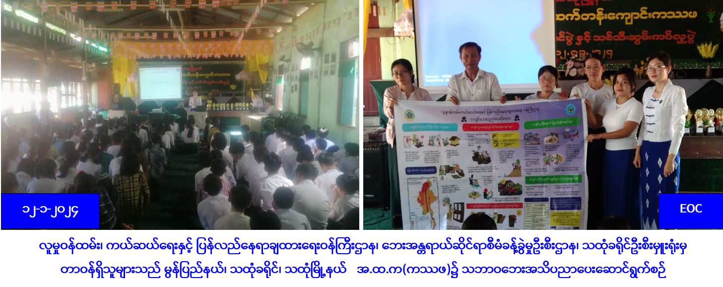 လူမှုဝန်ထမ်း၊ ကယ်ဆယ်ရေးနှင့် ပြန်လည်နေရာချထားရေးဝန်ကြီးဌာန၊ ဘေးအန္တရာယ်ဆိုင်ရာစီမံခန့်ခွဲမှုဦးစီးဌာန၊ သထုံခရိုင်ဦးစီးမှူးရုံးမှ တာဝန်ရှိသူများသည် (၁၂-၁-၂၀၂၄)ရက်နေ့၊ (၁၀း၃၀)နာရီအချိန်မှ(၁၂း၀၀)နာရီအချိန်ထိ မွန်ပြည်နယ်၊ သထုံခရိုင်၊ သထုံမြို့နယ် အ.ထ.က(ကဿဖ)ရှိ ကျောင်းသား/သူအင်အား(၁၅၀)ဦးခန့်အား သဘာဝဘေးအန္တရာယ်ဆိုင်ရာအသိပညာပေးနှင့်ပတ်သက်၍ သိရှိလိုက်နာဆောင်ရွက်ရမည့် ဆောင်ရန်/ရှောင်ရန်အချက်များအား ဟောပြောဆွေးနွေးခြင်း၊ လက်ကမ်းစာစောင်ဖြန့်ဝေခြင်း၊ ဗီနိုင်းပိုစတာနှင့် Mask ဖြန့်ဝေခြင်းတို့အား ဆောင်ရွက်ခဲ့ပါကြောင်း သတင်းရရှိပါသည်။