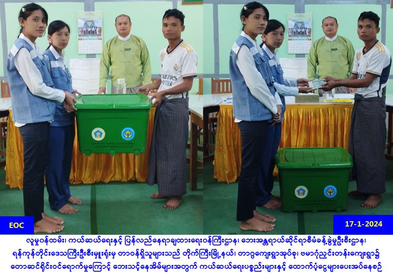 လူမှု၀န်ထမ်း၊ ကယ်ဆယ်ရေးနှင့် ပြန်လည်နေရာချထားရေး၀န်ကြီးဌာန၊ ဘေးအန္တရာယ်ဆိုင်ရာစီမံခန့်ခွဲမှု ဦးစီးဌာန၊ ရန်ကုန်တိုင်းဒေသကြီးဦးစီးမှူးရုံးမှ တာဝန်ရှိသူများသည် ရန်ကုန်တိုင်းဒေသကြီး၊ တိုက်ကြီး ခရိုင်၊ တိုက်ကြီးမြို့နယ်၊ တာဂွကျေးရွာအုပ်စု၊ ဗမာဂုံညှင်းတန်းကျေးရွာ၌ (၁၁-၁-၂၀၂၄) ရက်နေ့၊ (၁၅:၃၀) နာရီအချိန်ခန့်တွင် တောဆင်ရိုင်းဝင်ရောက်ဖျက်ဆီးမှုကြောင့် လုံးဝပျက်စီးနေအိမ် (၁)လုံး၊ တစ်စိတ်တစ်ပိုင်းနေအိမ် (၁)လုံး ပျက်စီးခဲ့ပြီး၊ ဘေးသင့်အိမ်ထောင်စု(၂)စု၊ လူဦးရေ (၁၀)ဦးတို့အတွက် ဆန်ရိက္ခာဖိုးထောက်ပံ့ငွေ(၂၁,၀၀ဝ/-)၊ အိမ်ဆောက်ပစ္စည်းဖိုးထောက်ပံ့ငွေ (၁၅၀,၀၀ဝ/-)၊ စုစုပေါင်း ထောက်ပံ့ငွေ (၁၇၁,၀၀ဝ/-)နှင့် ကယ်ဆယ်ရေးပစ္စည်း(၁၆)မျိုး အိမ်ထောင်စု(၁)စုစာ ကယ်ဆယ်ရေး ပစ္စည်းတန်းဖိုး (၆၅,၇၆၂/-)တို့အား (၁၇-၁-၂၀၂၄) ရက်နေ့(၁၂:၃၀)အချိန်တွင် တိုက်ကြီးမြို့နယ် အထွေထွေအုပ်ချုပ်ရေးဦးစီးဌာနမှ တာဝန်ရှိသူများနှင့်အတူ ပြည်သူများ၏ လက်ဝယ်အရောက် ထောက်ပံ့ ပေးအပ်ခဲ့ပါကြောင်း သတင်းရရှိပါသည်။