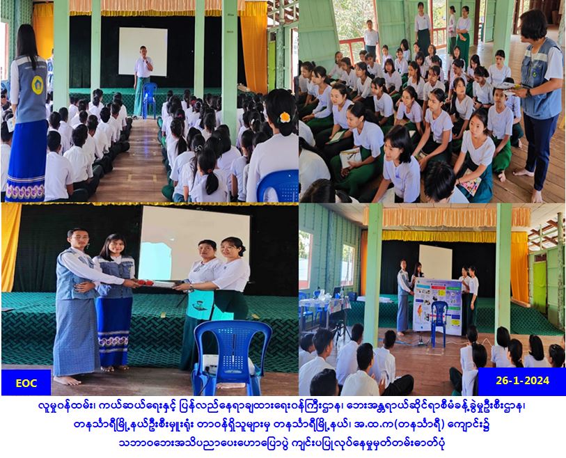 လူမှု၀န်ထမ်း၊ ကယ်ဆယ်ရေးနှင့် ပြန်လည်နေရာချထားရေး၀န်ကြီးဌာန၊ ဘေးအန္တရာယ်ဆိုင်ရာစီမံခန့်ခွဲမှု ဦးစီးဌာန၊ တနင်္သာရီမြို့နယ်ဦးစီးမှူးရုံးမှ တာဝန်ရှိသူများသည် (၂၆-၁-၂၀၂၄)ရက်နေ့၊ နံနက် (၀၉:၃၀) နာရီအချိန်တွင် တနင်္သာရီမြို့နယ်ရှိ အ.ထ.က(တနင်္သာရီ)ကျောင်းတွင် ကျောင်းသူ/ကျောင်းသားများ၊ ဆရာ/ဆရာမများ စုစုပေါင်း (၁၅၀)ဦးခန့်တို့အား သဘာဝဘေးအသိပညာပေး ဟောပြောပွဲပြုလုပ် ဆောင်ရွက်ခြင်း၊ သဘာဝဘေးအသိပညာပေး လက်ကမ်းစာစောင်များဖြန့်ဝေပေးခြင်းနှင့် ဗီနိုင်းပိုစတာ ဖြန့်ဝေပေးခြင်းများပြုလုပ်ဆောင်ရွက်ခဲ့ပါကြောင်း သတင်းရရှိပါသည်။