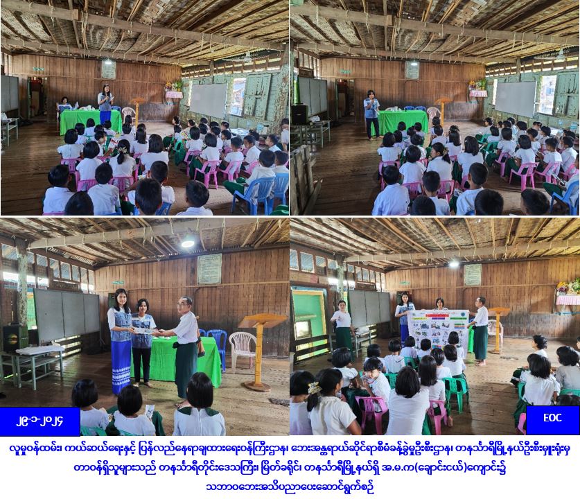 လူမှုဝန်ထမ်း၊ ကယ်ဆယ်ရေးနှင့် ပြန်လည်နေရာချထားရေးဝန်ကြီးဌာန၊ ဘေးအန္တရာယ်ဆိုင်ရာစီမံခန့်ခွဲမှုဦးစီးဌာန၊ တနင်္သာရီမြို့နယ်ဦးစီးမှူးရုံးမှ တာဝန်ရှိသူများသည် (၂၉-၁-၂၀၂၄)ရက်နေ့၊ နံနက် (၀၉း၃၀) နာရီအချိန်တွင် တနင်္သာရီတိုင်းဒေသကြီး၊ မြိတ်ခရိုင်၊ တနင်္သာရီမြို့နယ်ရှိ အ.မ.က(ချောင်းငယ်)ကျောင်း၌ ကျောင်းသူ/ကျောင်းသားနှင့် ဆရာ/ဆရာမ(၁၀၀)ဦးခန့်အား သဘာဝဘေးအသိပညာပေးဟောပြောပွဲပြုလုပ်ဆောင်ရွက်ခြင်း၊ သဘာဝဘေးအသိပညာပေးလက်ကမ်းစာစောင်များဖြန့်ဝေခြင်းနှင့် ဗွီနိုင်းပိုစတာ ဖြန့်ဝေခြင်းများ ပြုလုပ်ဆောင်ရွက်ခဲ့ကြောင်း သတင်းရရှိပါသည်။