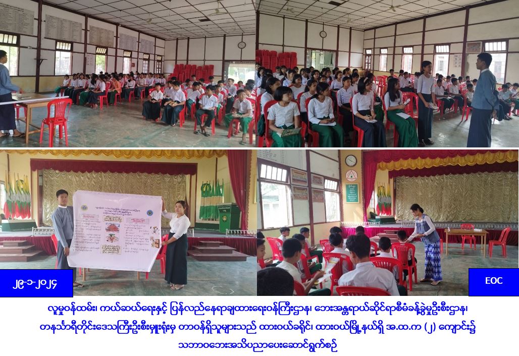 လူမှုဝန်ထမ်း၊ ကယ်ဆယ်ရေးနှင့် ပြန်လည်နေရာချထားရေးဝန်ကြီးဌာန၊ ဘေးအန္တရာယ်ဆိုင်ရာစီမံခန့်ခွဲမှုဦးစီးဌာန၊ တနင်္သာရီတိုင်းဒေသကြီးဦးစီးမှူးရုံးမှ တာဝန်ရှိသူများသည် (၂၉-၁-၂၀၂၄)ရက်နေ့၊ နံနက်(၁၀:၁၅) နာရီအချိန်တွင် ထားဝယ်ခရိုင်၊ ထားဝယ်မြို့နယ်ရှိ အ.ထ.က (၂) ကျောင်း၌ ကျောင်းသား/သူ(၁၀၀)ဦးခန့်အား သဘာဝဘေးအန္တရာယ်များနှင့်ပတ်သက်၍ အသိပညာပေးဟောပြောပွဲဆောင်ရွက်ခြင်း၊ သဘာဝဘေးအသိပညာပေးလက်ကမ်းစာစောင်များနှင့် ဗွီနိုင်းပိုစတာဖြန့်ဝေခြင်းများ ဆောင်ရွက်ခဲ့ကြောင်းသိရှိရပါသည်။