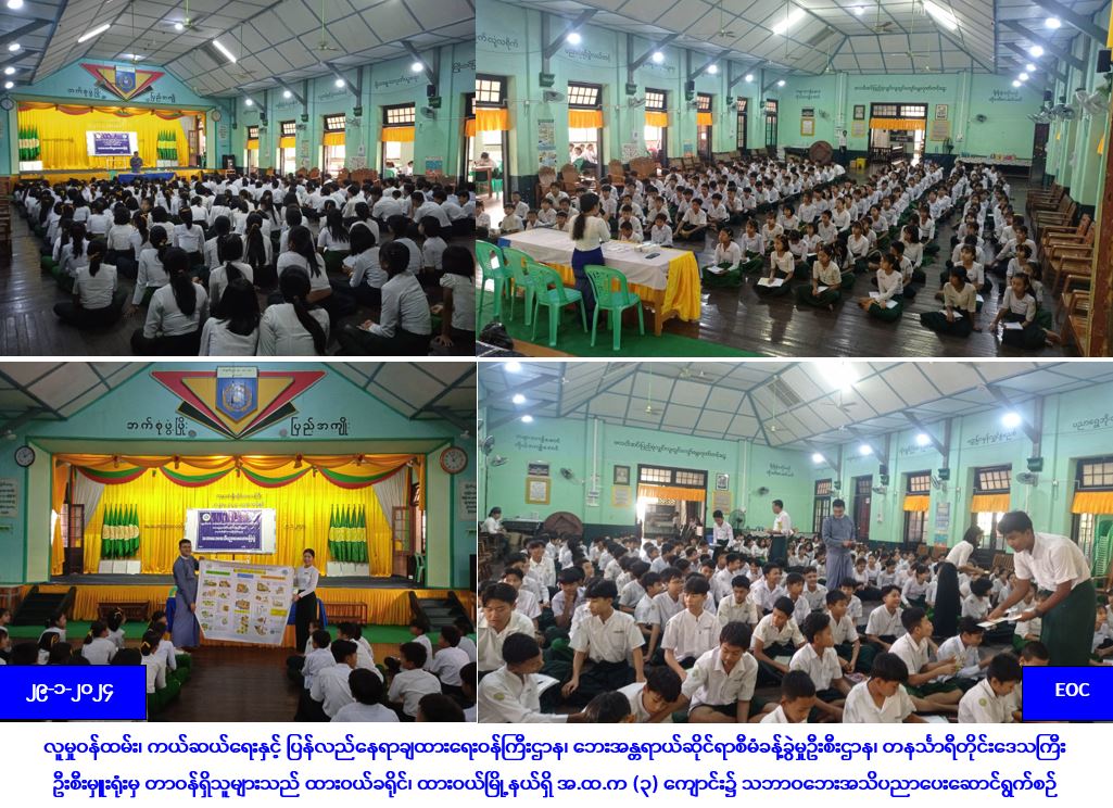 လူမှုဝန်ထမ်း၊ ကယ်ဆယ်ရေးနှင့် ပြန်လည်နေရာချထားရေးဝန်ကြီးဌာန၊ ဘေးအန္တရာယ်ဆိုင်ရာစီမံခန့်ခွဲမှုဦးစီးဌာန၊ တနင်္သာရီတိုင်းဒေသကြီးဦးစီးမှူးရုံးမှ တာဝန်ရှိသူများသည် (၂၉-၁-၂၀၂၄)ရက်နေ့၊ နံနက်(၁၀:၃၀) နာရီအချိန်တွင် ထားဝယ်ခရိုင်၊ ထားဝယ်မြို့နယ်ရှိ အ.ထ.က (၃) ကျောင်း၌ ကျောင်းသား/သူ(၂၀၀)ဦးခန့်အား သဘာဝဘေးအန္တရာယ်များနှင့်ပတ်သက်၍ အသိပညာပေးဟောပြောပွဲဆောင်ရွက်ခြင်း၊ သဘာဝဘေးအသိပညာပေးလက်ကမ်းစာစောင်များနှင့် ဗွီနိုင်းပိုစတာဖြန့်ဝေခြင်းများ ဆောင်ရွက်ခဲ့ကြောင်းသိရှိရပါသည်။