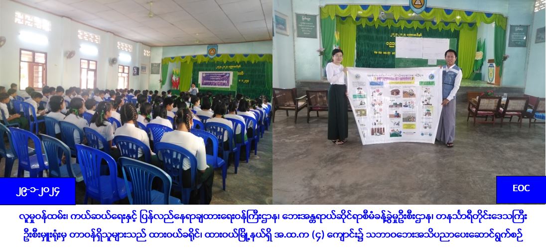 လူမှုဝန်ထမ်း၊ ကယ်ဆယ်ရေးနှင့် ပြန်လည်နေရာချထားရေးဝန်ကြီးဌာန၊ ဘေးအန္တရာယ်ဆိုင်ရာစီမံခန့်ခွဲမှုဦးစီးဌာန၊ တနင်္သာရီတိုင်းဒေသကြီးဦးစီးမှူးရုံးမှ တာဝန်ရှိသူများသည် (၂၉-၁-၂၀၂၄)ရက်နေ့၊ နံနက်(၁၀:၃၀) နာရီအချိန်တွင် ထားဝယ်ခရိုင်၊ ထားဝယ်မြို့နယ်ရှိ အ.ထ.က (၄) ကျောင်း၌ ကျောင်းသား/သူ(၁၂၀)ဦးခန့်အား သဘာဝဘေးအန္တရာယ်များနှင့်ပတ်သက်၍ အသိပညာပေးဟောပြောပွဲဆောင်ရွက်ခြင်း၊ သဘာဝဘေးအသိပညာပေးလက်ကမ်းစာစောင်များနှင့် ဗွီနိုင်းပိုစတာဖြန့်ဝေခြင်းများ ဆောင်ရွက်ခဲ့ကြောင်းသိရှိရပါသည်။