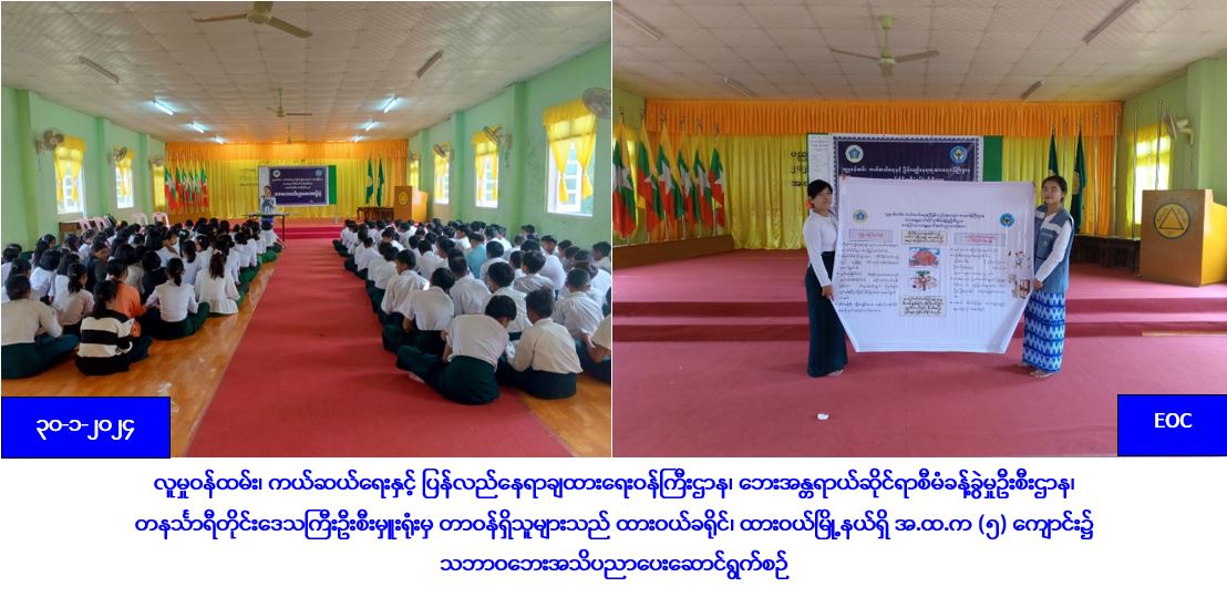 လူမှုဝန်ထမ်း၊ ကယ်ဆယ်ရေးနှင့် ပြန်လည်နေရာချထားရေးဝန်ကြီးဌာန၊ ဘေးအန္တရာယ်ဆိုင်ရာစီမံခန့်ခွဲမှုဦးစီးဌာန၊ တနင်္သာရီတိုင်းဒေသကြီးဦးစီးမှူးရုံးမှ တာဝန်ရှိသူများသည် (၃၀-၁-၂၀၂၄)ရက်နေ့၊ နံနက်(၁၀:၀၀)နာရီအချိန်တွင် ထားဝယ်ခရိုင်၊ ထားဝယ်မြို့နယ်ရှိ အ.ထ.က (၅) ကျောင်း၌ ကျောင်းသား/သူ(၁၂၀)ဦးခန့်အား သဘာဝဘေးအန္တရာယ်များနှင့်ပတ်သက်၍ အသိပညာပေးဟောပြောပွဲဆောင်ရွက်ခြင်း၊ သဘာဝဘေးအသိပညာပေးလက်ကမ်းစာစောင်များနှင့် ဗွီနိုင်းပိုစတာဖြန့်ဝေခြင်းများ ဆောင်ရွက်ခဲ့ကြောင်းသိရှိရပါသည်။