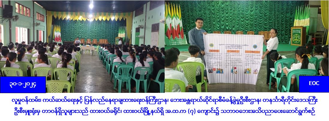 လူမှုဝန်ထမ်း၊ ကယ်ဆယ်ရေးနှင့် ပြန်လည်နေရာချထားရေးဝန်ကြီးဌာန၊ ဘေးအန္တရာယ်ဆိုင်ရာစီမံခန့်ခွဲမှုဦးစီးဌာန၊ တနင်္သာရီတိုင်းဒေသကြီးဦးစီးမှူးရုံးမှ တာဝန်ရှိသူများသည် (၃၀-၁-၂၀၂၄)ရက်နေ့၊ နံနက်(၁၀:၀၀) နာရီအချိန်တွင် ထားဝယ်ခရိုင်၊ ထားဝယ်မြို့နယ်ရှိ အ.ထ.က (၇) ကျောင်း၌ ကျောင်းသား/သူ(၁၇၀)ဦးခန့်အား သဘာဝဘေးအန္တရာယ်များနှင့်ပတ်သက်၍ အသိပညာပေးဟောပြောပွဲဆောင်ရွက်ခြင်း၊ သဘာဝဘေးအသိပညာပေးလက်ကမ်းစာစောင်များနှင့် ဗွီနိုင်းပိုစတာဖြန့်ဝေခြင်းများ ဆောင်ရွက်ခဲ့ကြောင်းသိရှိရပါသည်။