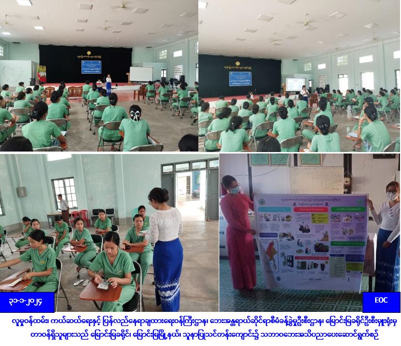 လူမှုဝန်ထမ်း၊ ကယ်ဆယ်ရေးနှင့် ပြန်လည်နေရာချထားရေးဝန်ကြီးဌာန၊ ဘေးအန္တရာယ်ဆိုင်ရာစီမံခန့်ခွဲမှုဦးစီးဌာန၊ မြောင်းမြခရိုင်ဦးစီးမှူးရုံးမှ တာဝန်ရှိသူများသည် (၃၁-၁-၂၀၂၄)ရက်နေ့၊ (၀၉;၃၀)နာရီအချိန်မှ (၁၂:၀၀)နာရီအချိန်ထိ မြောင်းမြခရိုင်၊ မြောင်းမြမြို့နယ်၊ သူနာပြုသင်တန်းကျောင်း၌ ကျောင်းအုပ်ကြီးနှင့်တကွ ဆရာ/ဆရာမများ၊ ကျောင်းသား/ကျောင်းသူ(၁၅၀)ဦးတို့အား ဦးစီးဌာန၏ လုပ်ငန်းဆောင်ရွက်နေမှုများ၊ ထောက်ပံ့ပေးမှုများ၊ သဘာဝဘေးနင့်ပတ်သက်သော ဆောင်ရန်/ရှောင်ရန်များ၊ မီးခိုးညစ်ညမ်းမှု၊ တောမီးအန္တရာယ်နှင့် ပလတ်စတစ်ညစ်ညမ်းမှုတို့နှင့်စပ်လျဉ်းသည့်ဆောင်ရန်/ရှောင်ရန်အချက်များအား ဆွေးနွေးဟောပြောခဲ့ပြီး နံရံကပ်ပိုစတာ၊ ဗွီနိုင်းပိုစတာနှင့် လက်ကမ်းစာစောင်များ ဖြန့်ဝေပေးခဲ့ပါကြောင်း သိရှိရပါသည်။