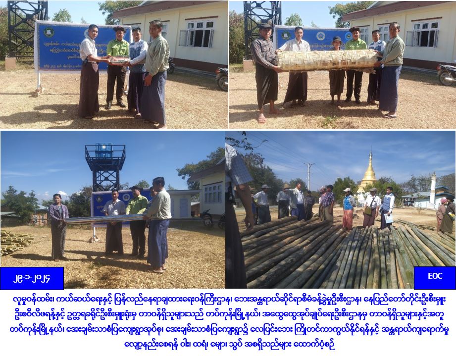 လူမှုဝန်ထမ်း၊ ကယ်ဆယ်ရေးနှင့် ပြန်လည်နေရာချထားရေးဝန်ကြီးဌာန၊ ဘေးအန္တရာယ်ဆိုင်ရာစီမံခန့်ခွဲမှုဦးစီးဌာန၊ ပြည်ထောင်စုနယ်မြေ၊ နေပြည်တော်တိုင်းဦးစီးမှူး ဦးစဝီလီဖရန့်နှင့် ဥတ္တရခရိုင်ဦးစီးမှူးရုံးမှ တာဝန်ရှိသူများသည် တပ်ကုန်းမြို့နယ်၊ အထွေထွေအုပ်ချုပ်ရေးဦးစီးဌာနမှ တာဝန်ရှိသူများနှင့်အတူ (၂၉-၁-၂၀၂၄)ရက်နေ့၊ (၁၃:၀၀) နာရီအချိန်တွင် တပ်ကုန်းမြို့နယ်၊ အေးချမ်းသာစံပြကျေးရွာအုပ်စု၊ အေးချမ်းသာစံပြကျေးရွာ၌ လေပြင်းဘေး ကြိုတင်ကာကွယ်နိုင်ရန်နှင့် အန္တရာယ်ကျရောက်မှု လျော့နည်းစေရန် ရည်ရွယ်၍ အမှီအခိုကင်းသည့်သက်ကြီးရွယ်အိုများ၊ အမျိုးသမီးဦးဆောင်သော အိမ်ထောင်စုများမှ လိုအပ်လျက်ရှိသော နေအိမ်များနှင့် ကျေးရွာအတွင်း လိုအပ်လျက်ရှိသော(ဆင်းရဲနွမ်းပါးမှု/ကြံ့ခိုင်မှုမရှိသည့်)နေအိမ်များနှင့် မဖြစ်မနေပြုပြင်ရန် လိုအပ်သောနေအိမ်များအား ပြန်လည်ပြုပြင်မွမ်းမံပြင်ဆင်ရန် ဝါး၊ ထရံ၊ မျော၊ သွပ် အစရှိသည်များကို ထောက်ပံ့ပေးအပ်ခဲ့ကြောင်း သိရှိရပါသည်။